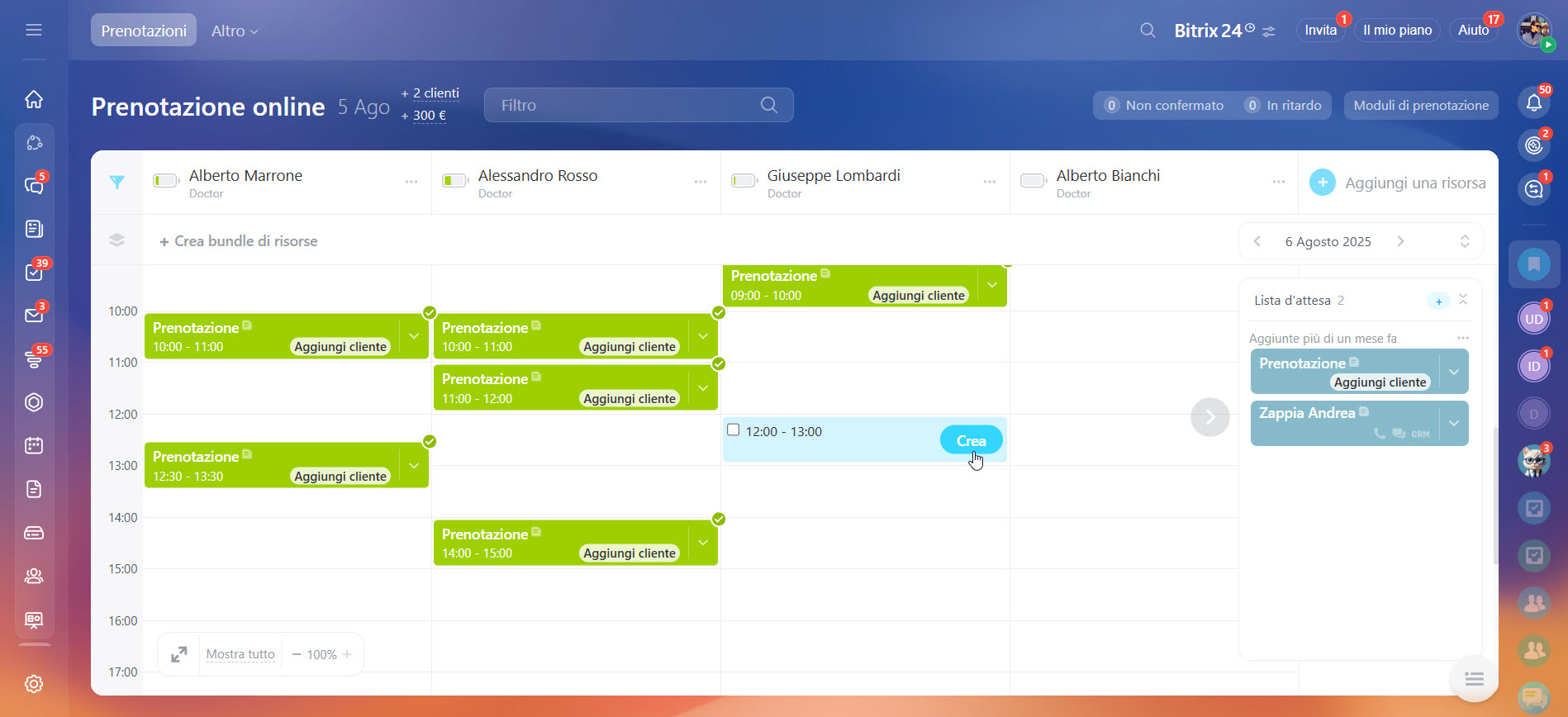La prenotazione online di Bitrix24 è ideale per le aziende che offrono servizi su appuntamento o noleggiano risorse, come attrezzature, spazi di lavoro o strumenti.