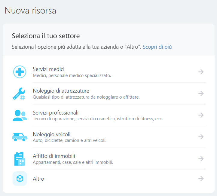 Vai nella sezione "Prenotazioni", clicca su "Aggiungi una risorsa" e seleziona il settore di attività della tua azienda. Questo adatterà automaticamente le impostazioni della risorsa, offrendo la tipologia e i modelli di messaggio più adatti, come quelli per la prenotazione di specialisti o attrezzature.