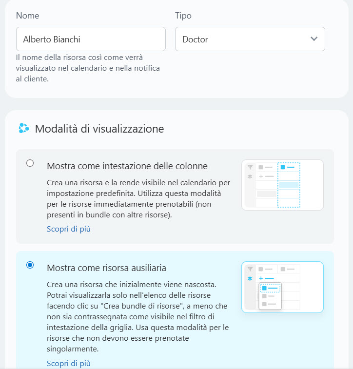 Mostra come risorsa ausiliaria. Seleziona questa opzione se la risorsa è prenotata solo insieme a una risorsa principale. Non apparirà come una colonna separata nella bacheca di pianificazione, ma potrà essere trovata in un elenco aggiuntivo. -