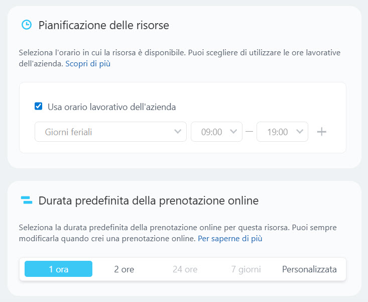 Configura l'orario di lavoro e specifica quando la risorsa sarà disponibile per la prenotazione. Utilizza l'orario di lavoro della tua azienda o imposta un programma personalizzato. Le impostazioni ti consentono di definire in modo flessibile la disponibilità per qualsiasi giorno della settimana.