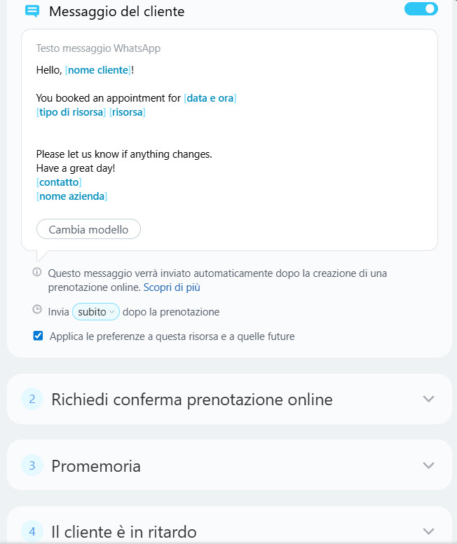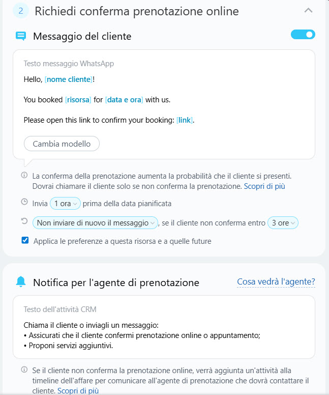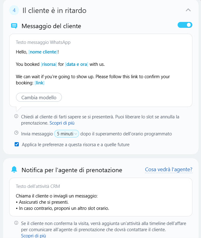 Nei messaggi "Richiedi conferma prenotazione" e "Cliente in ritardo", puoi impostare gli agenti in modo che ricevano notifiche se il cliente non ha confermato la prenotazione o è in ritardo.