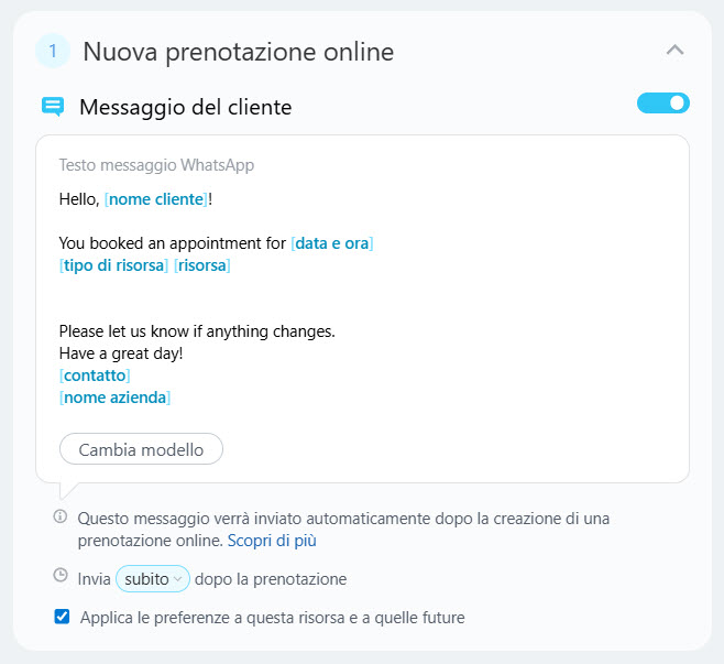 Successivamente, configura i messaggi automatici per avvisare i clienti di nuove prenotazioni, richiedere conferme, inviare promemoria per le visite o contattarli in caso di ritardo.