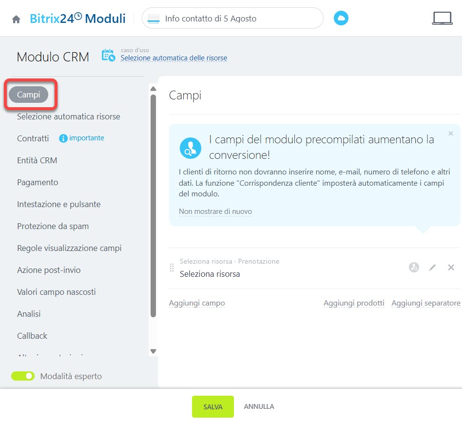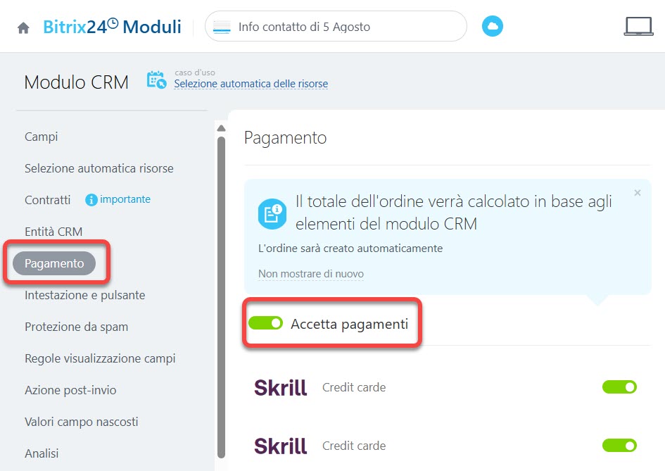 Per abilitare i pagamenti, è sufficiente attivare la "Modalità esperto" nelle impostazioni del modulo. Sarà inoltre necessario collegare i sistemi di pagamento per iniziare ad accettare pagamenti.