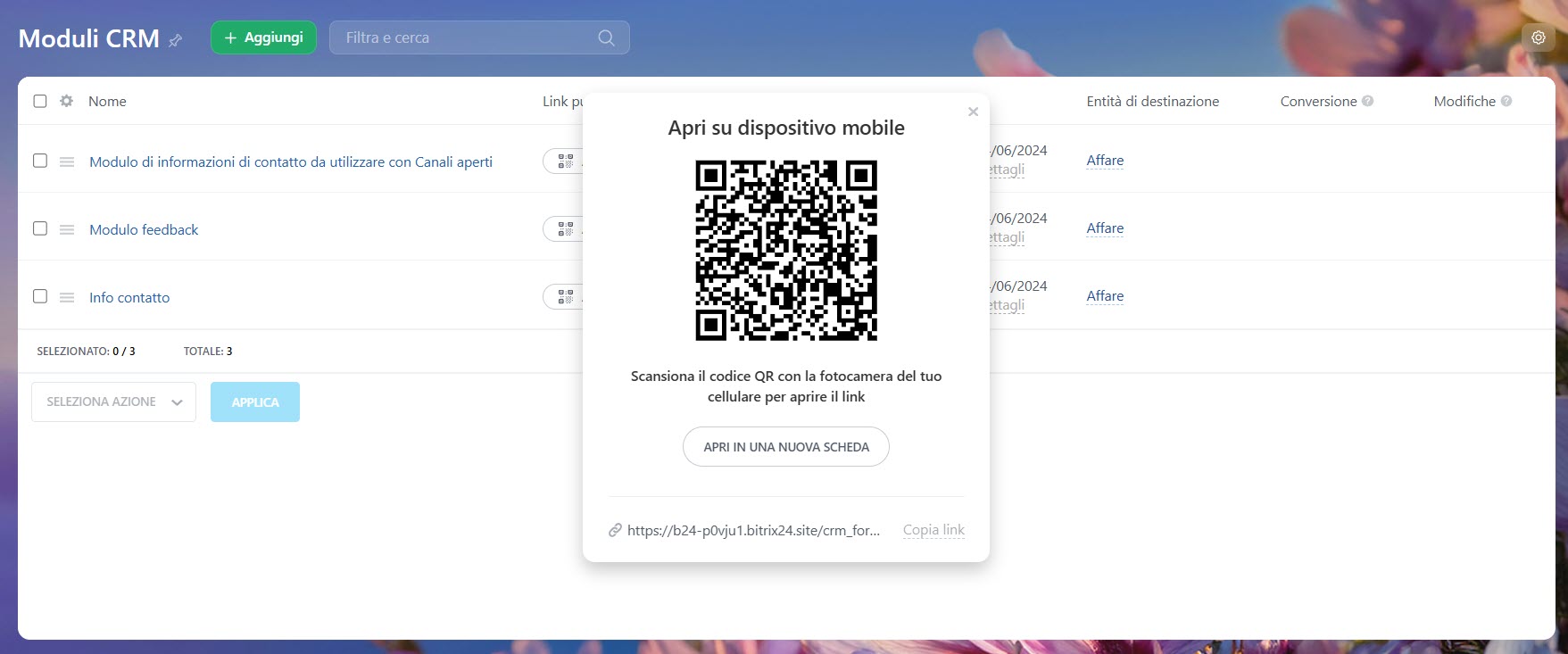 Per accedere ai moduli creati, vai su Prenotazioni → Moduli di prenotazione → Tutti i moduli. Lì troverai anche il codice e il link pubblico necessari per pubblicare e condividere il modulo.