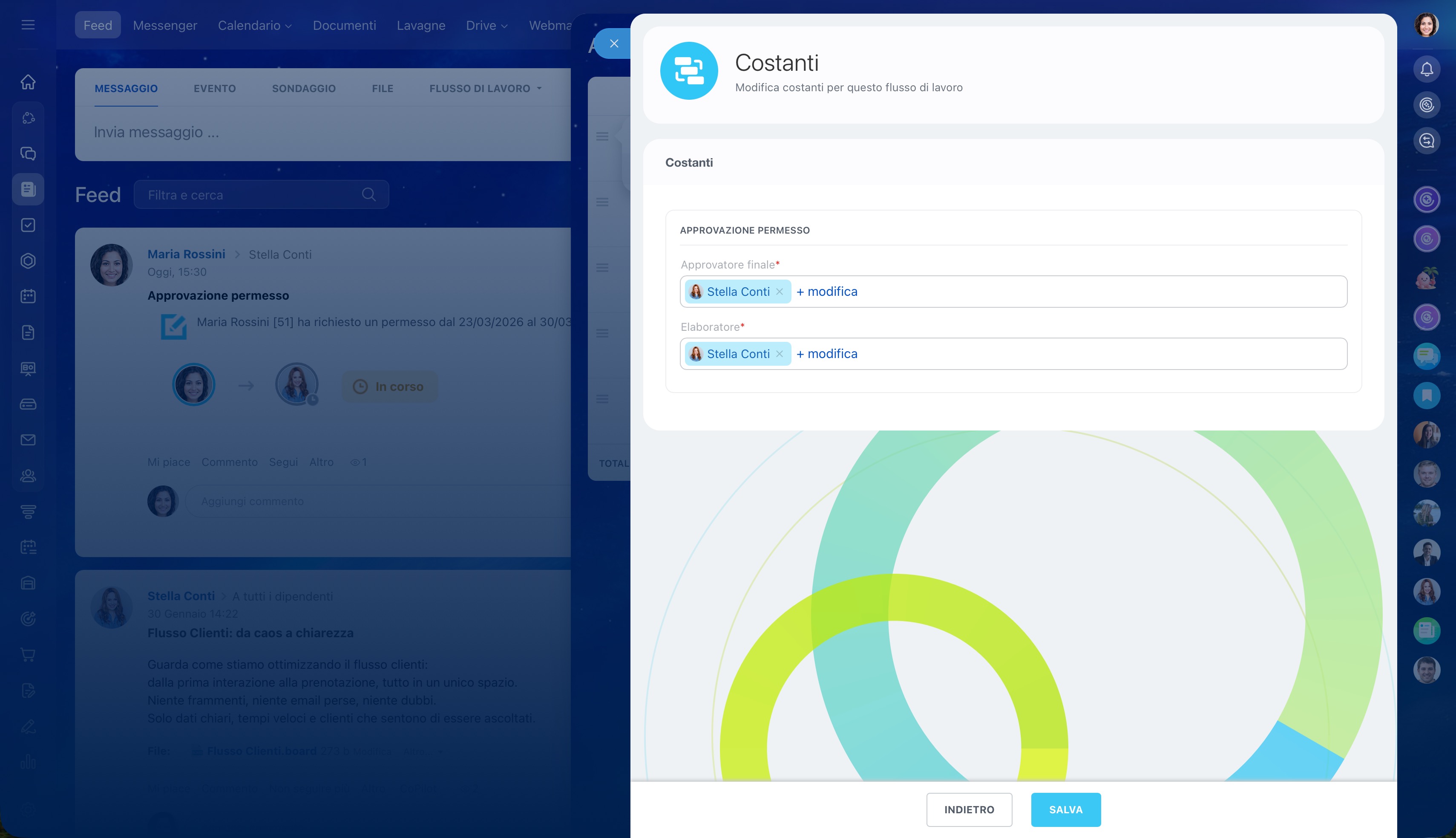 Al primo avvio, Bitrix24 ti chiederà di configurare i parametri del flusso di lavoro. Nella finestra che appare, specifica chi sarà responsabile dell'approvazione finale e chi elaborerà la richiesta di ferie.