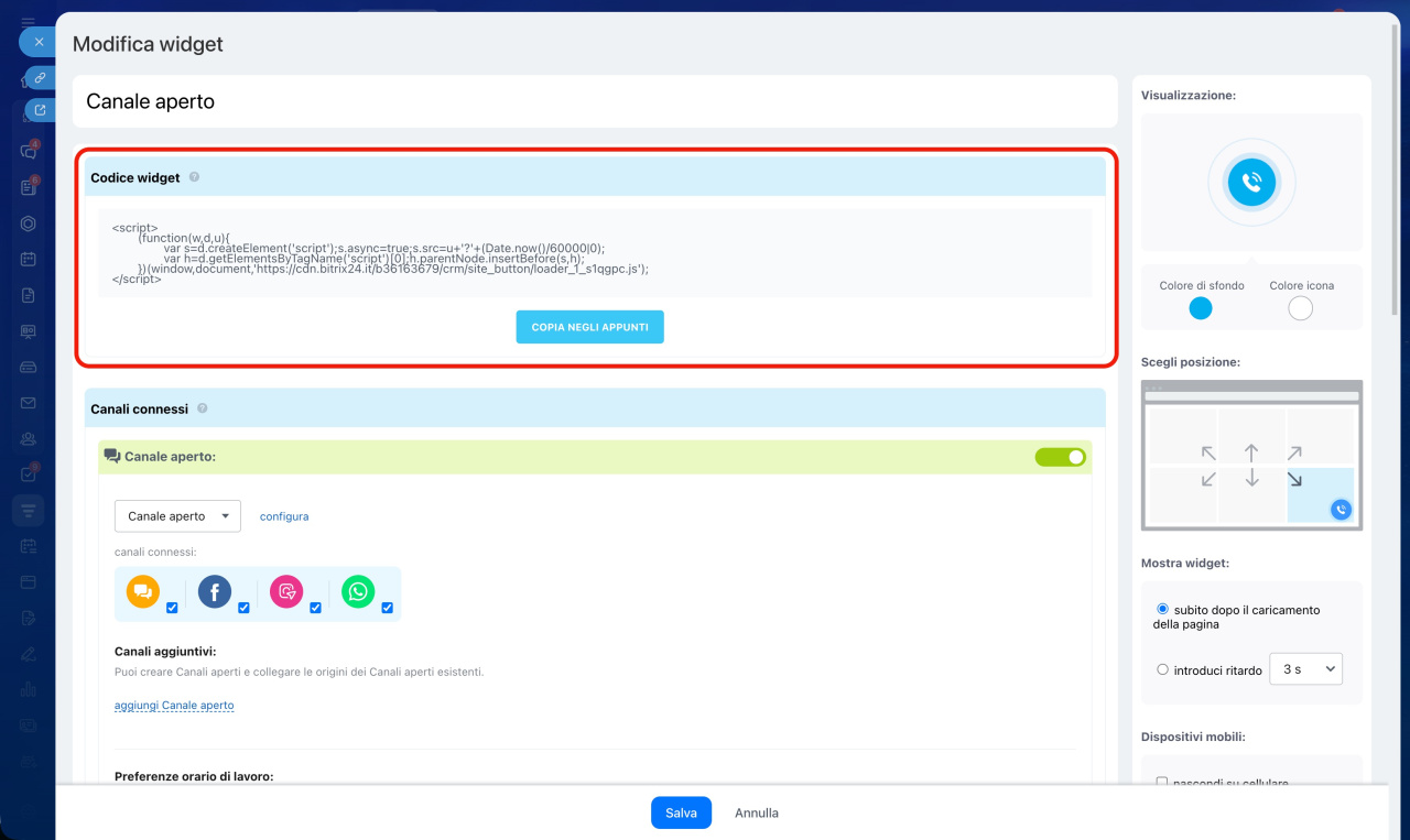 Salva il sito web. Ora i tuoi clienti possono contattarti usando il widget Bitrix24.