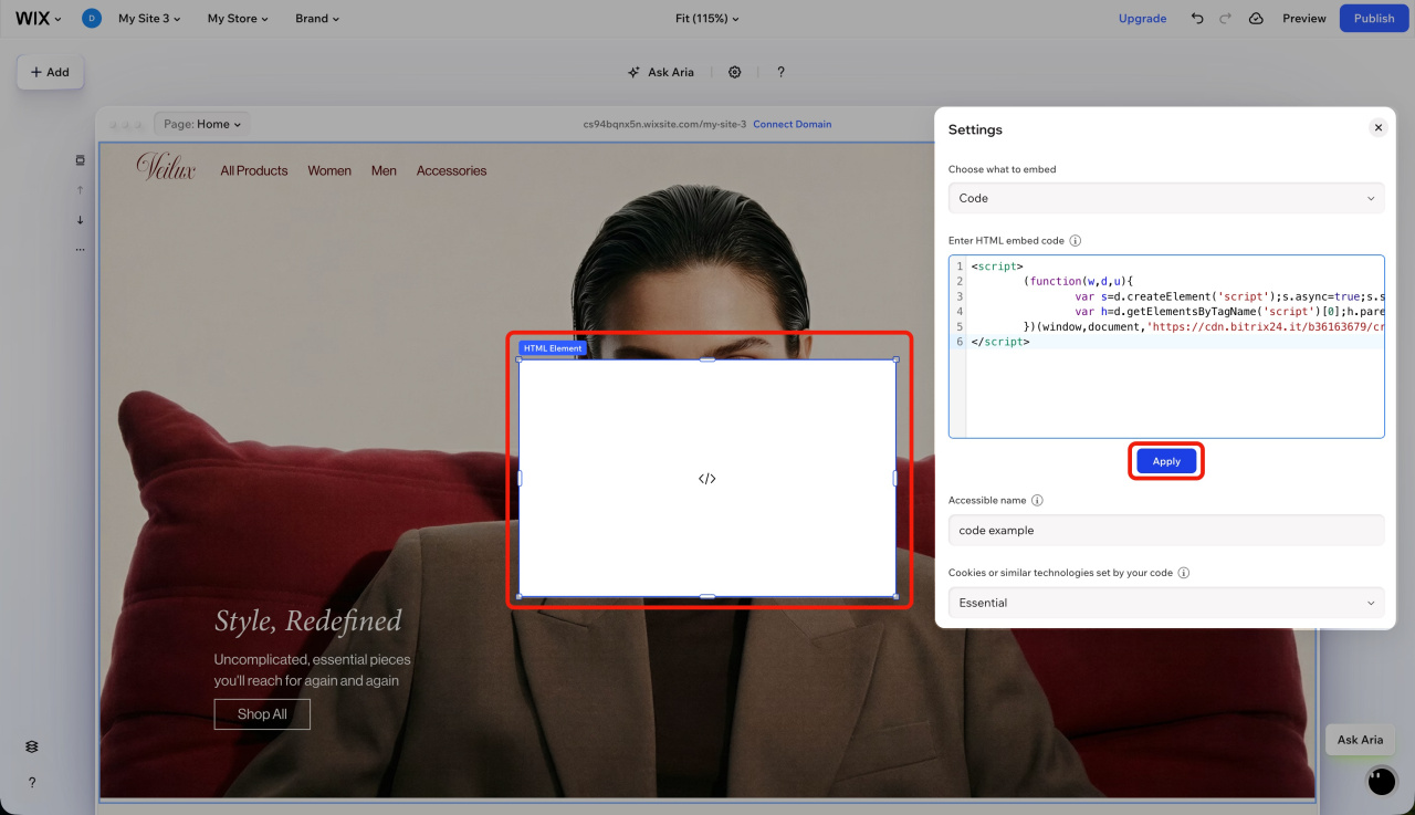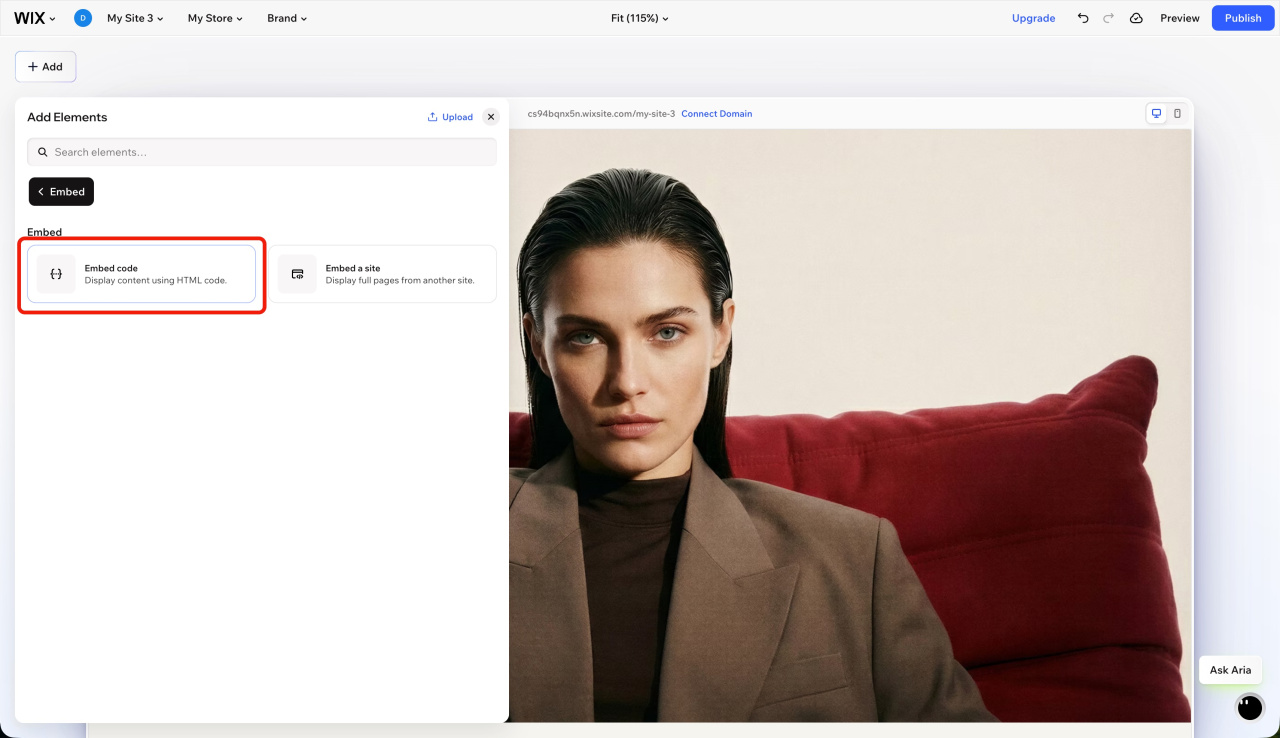 Premi Add > Embed > Embed code nell'editor del sito web WIX.