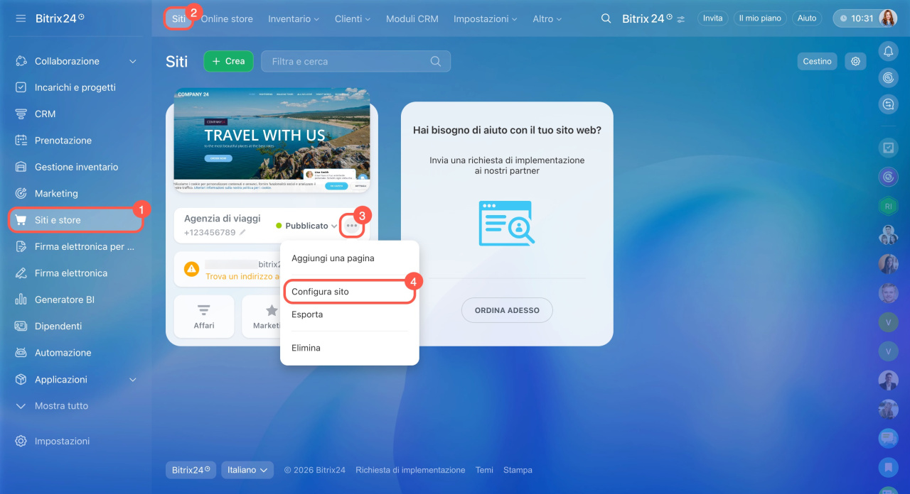 In Bitrix24, vai su Siti e store > Siti, seleziona il sito web desiderato e fai clic su Tre punti (...) > Configura sito > Pixel di tracciamento. Incolla l’ID del pixel Facebook e salva le modifiche. Per applicare correttamente le modifiche, rimuovi il sito dalla pubblicazione e pubblicalo di nuovo.