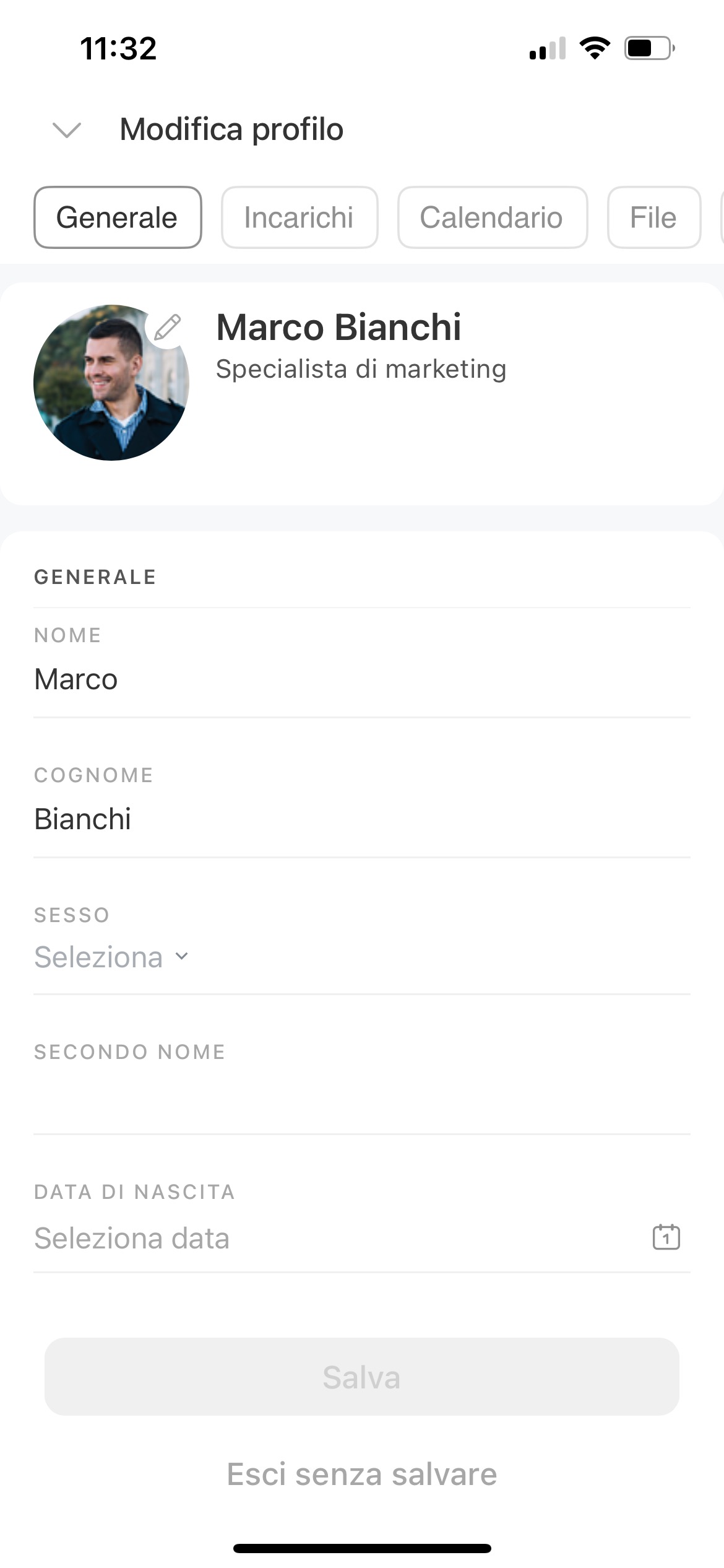- Le informazioni del profilo possono essere modificate in qualsiasi momento dal dipendente o dall'amministratore di Bitrix24.