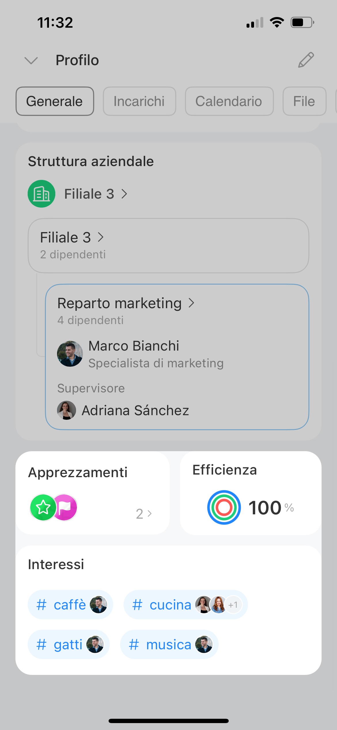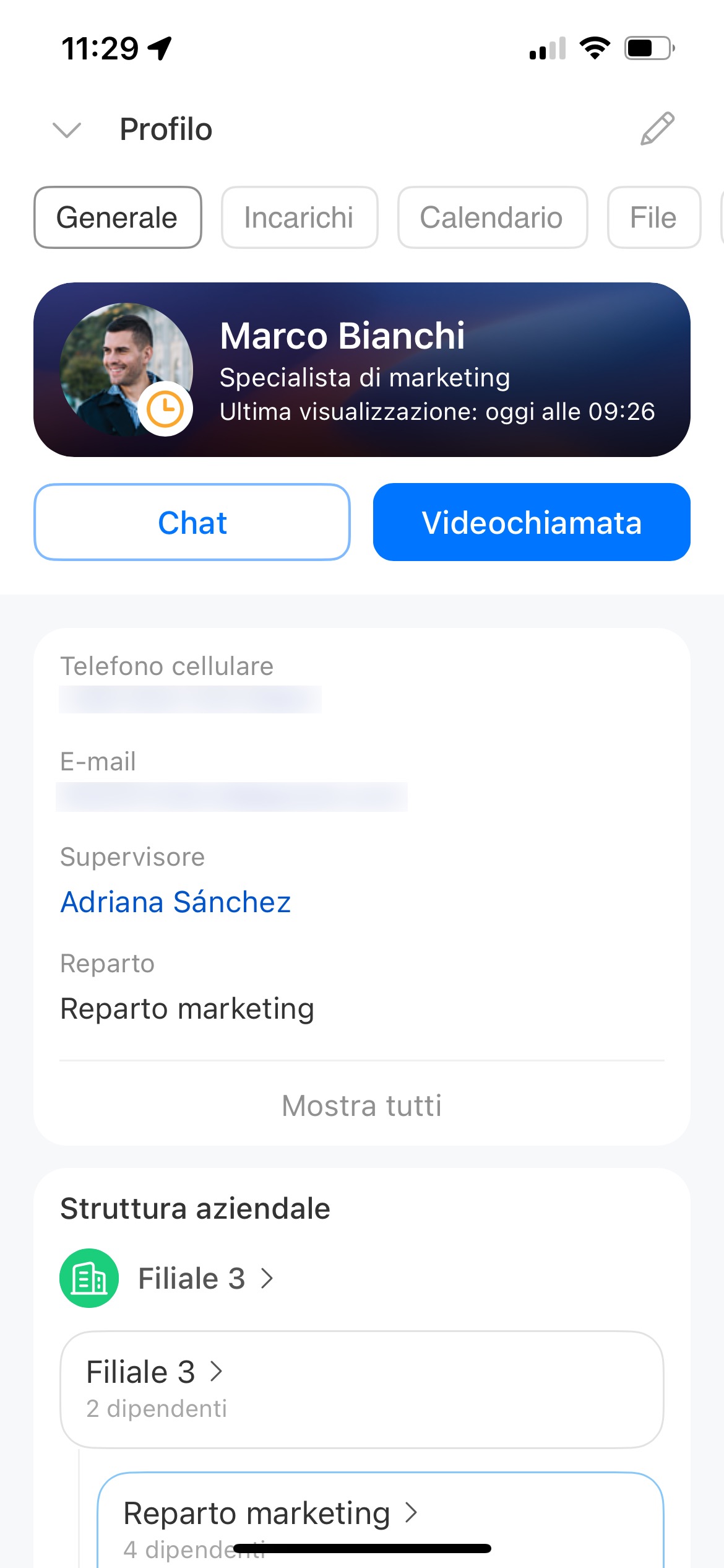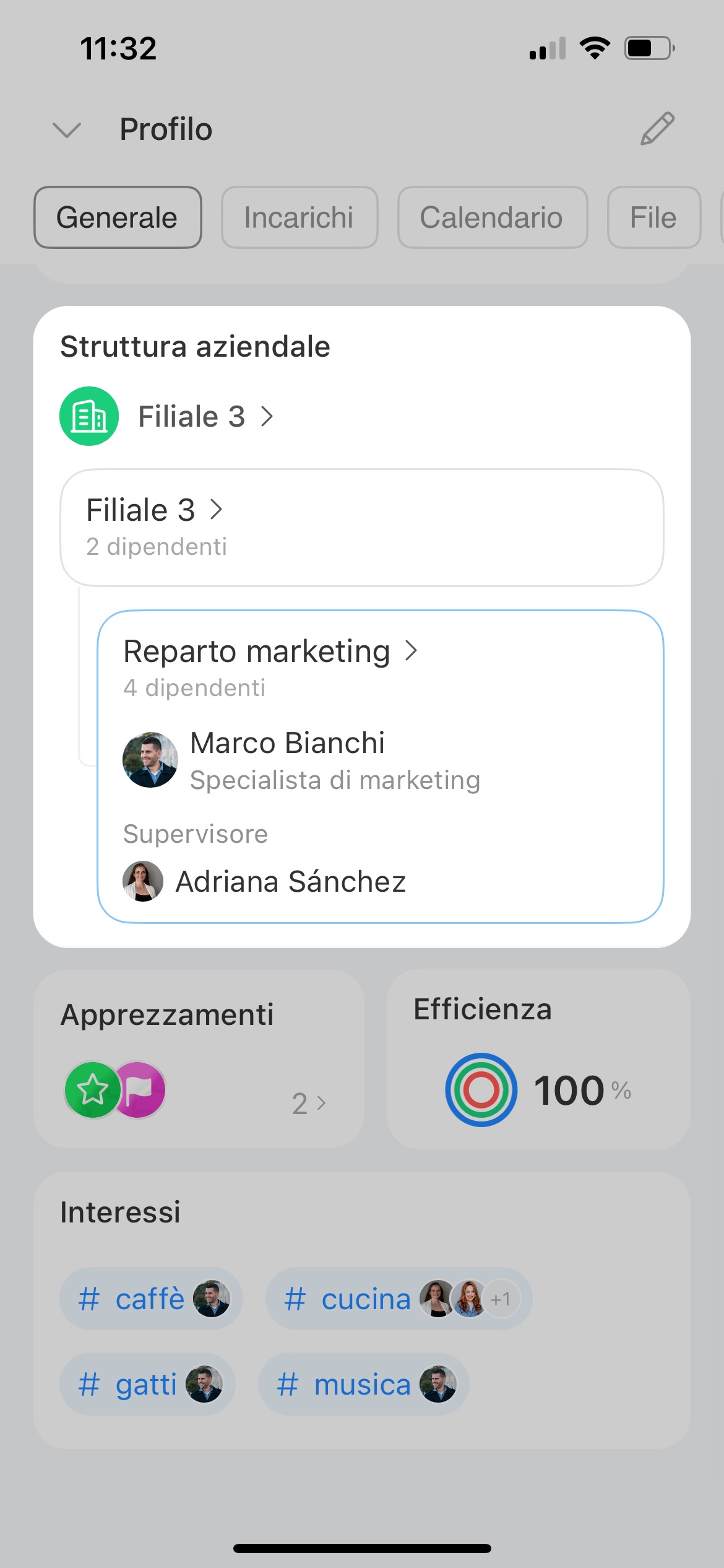 Struttura aziendale. In questa sezione viene visualizzata la posizione del dipendente nella struttura aziendale: reparto, supervisore, numero di subordinati o colleghi del team. È possibile comprendere rapidamente come è organizzata l'unità e accedere immediatamente al profilo del dipendente desiderato.