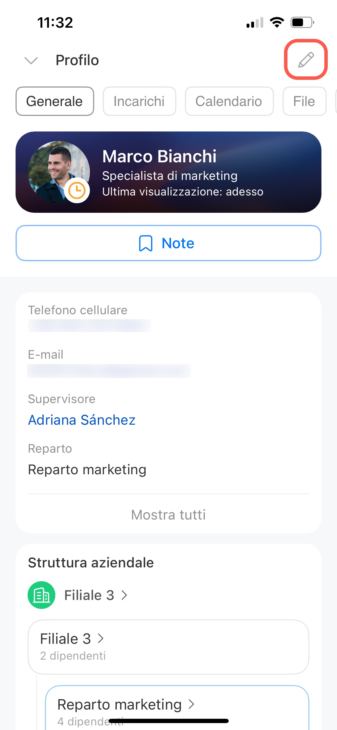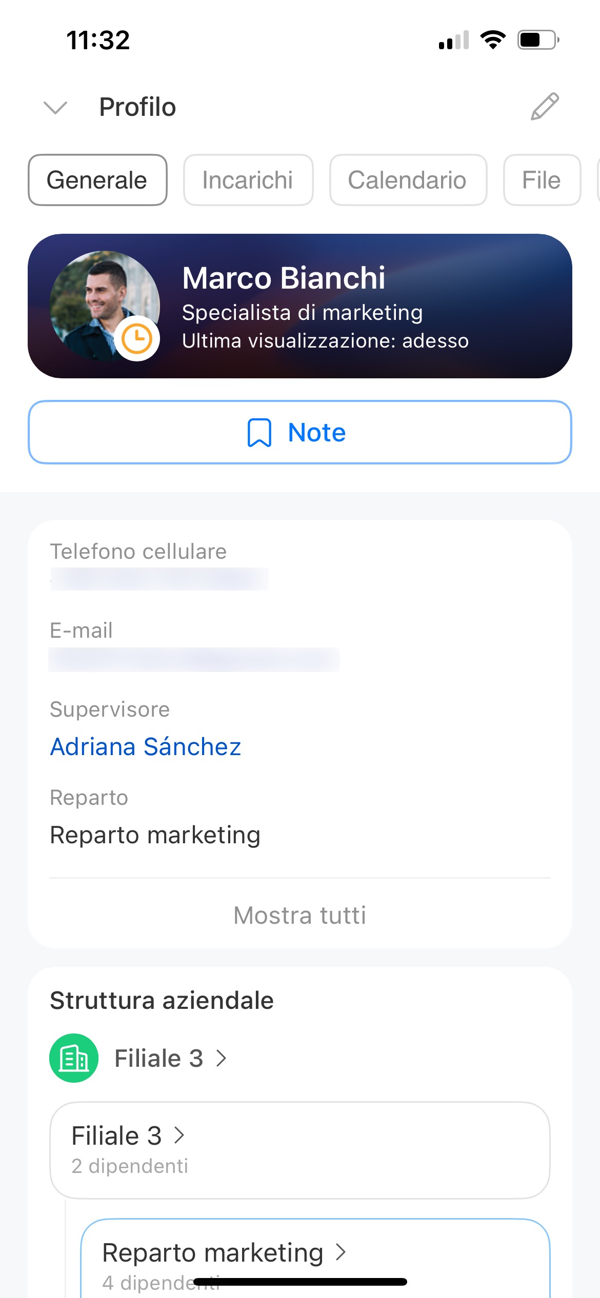 Informazioni di contatto. Qui puoi trovare il nome, cognome, numero di telefono, e-mail, posizione e altri dati del dipendente. Queste informazioni aiutano a capire per quali questioni contattare il dipendente e come raggiungerlo.
