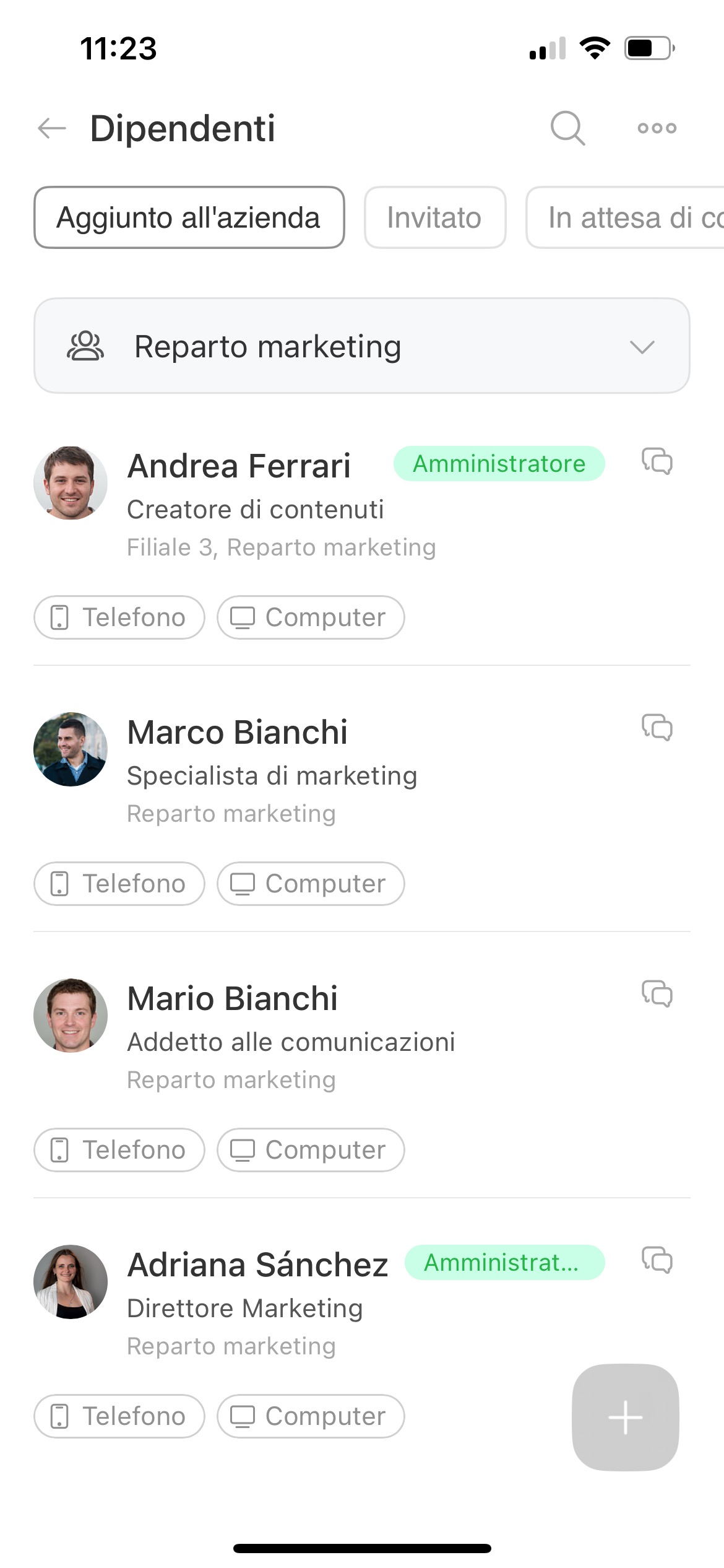 Ruolo del dipendente. Un'icona nel profilo mostra il ruolo del dipendente nell'azienda: Ospite, Integratore, Amministratore. Ad esempio, un Amministratore può gestire i permessi di accesso, configurare processi aziendali e altri strumenti.