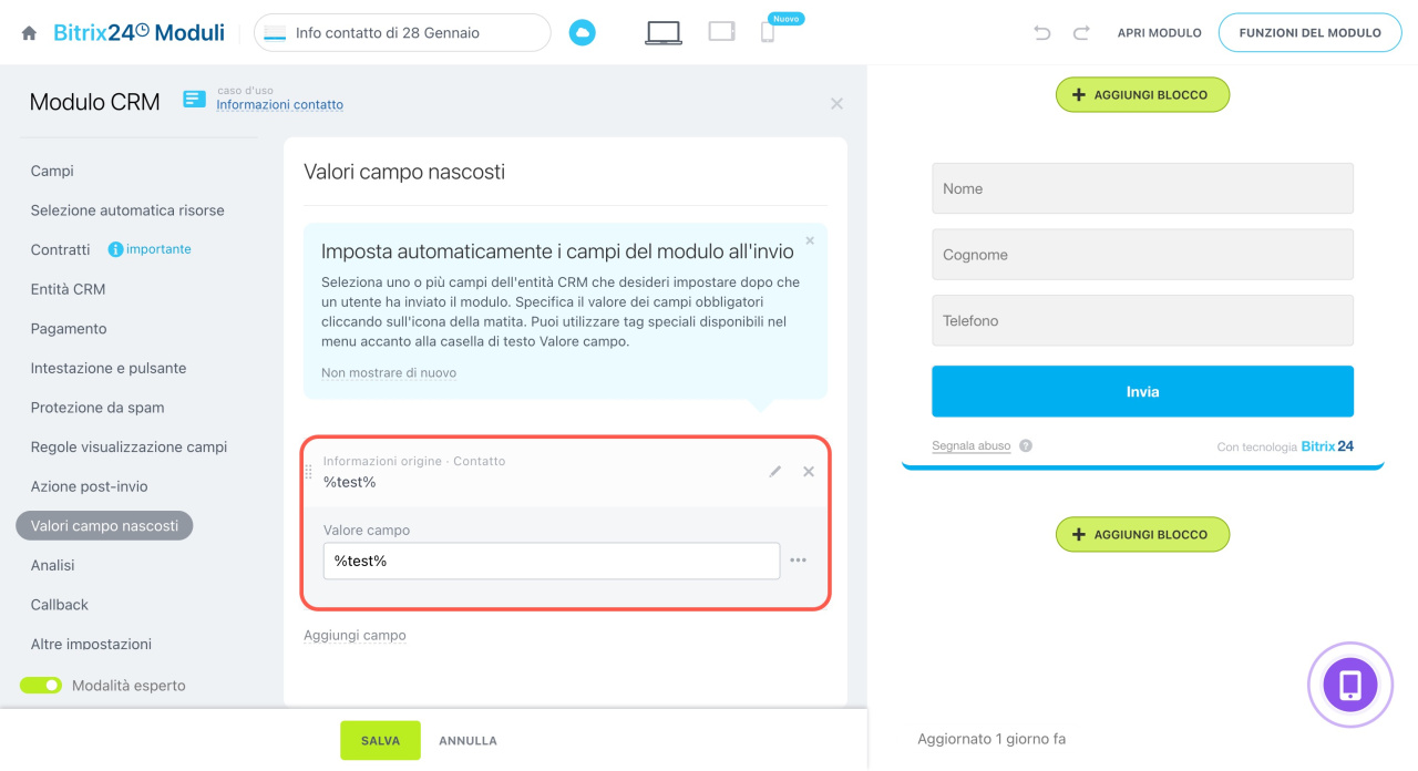 Imposta il riempimento automatico dei campi nascosti nei moduli CRM