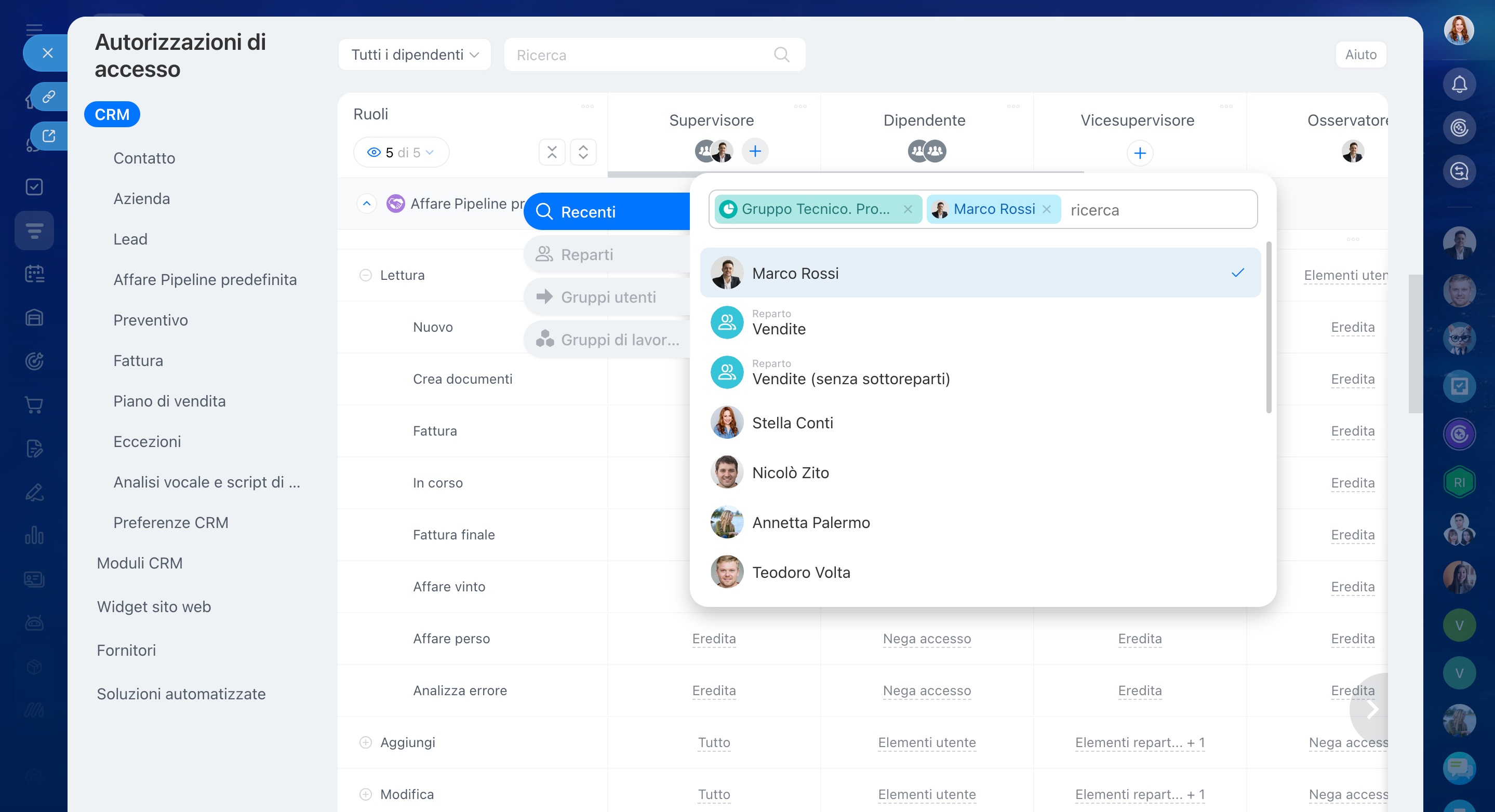 Per verificare l’intersezione delle autorizzazioni, seleziona il dipendente nel campo accanto alla barra di ricerca. Nel pannello laterale verranno mostrati i ruoli assegnati, permettendoti di capire quali azioni sono disponibili e, se necessario, modificare le impostazioni.