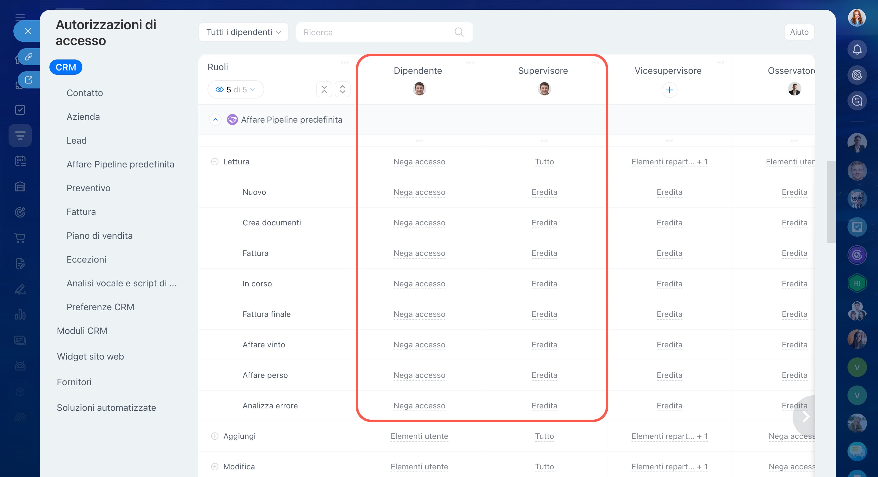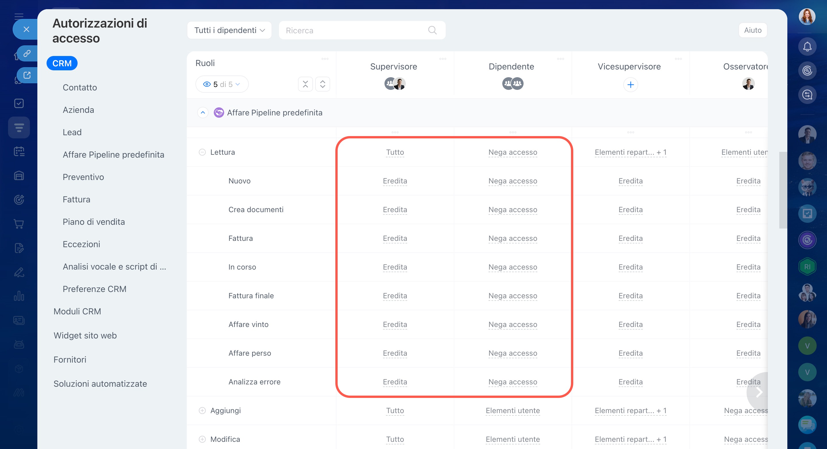 In questo caso il dipendente non avrà accesso agli affari, poiché le autorizzazioni di accesso dettagliate hanno maggiore priorità rispetto a quelle ereditate.
