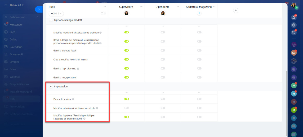 Vai nella sezione CRM > Impostazioni > Autorizzazioni di accesso all'inventario. Per consentire ai dipendenti di modificare i parametri del catalogo, gestire le autorizzazioni di accesso e abilitare la vendita di prodotti non disponibili, attiva per loro le seguenti autorizzazioni di accesso: