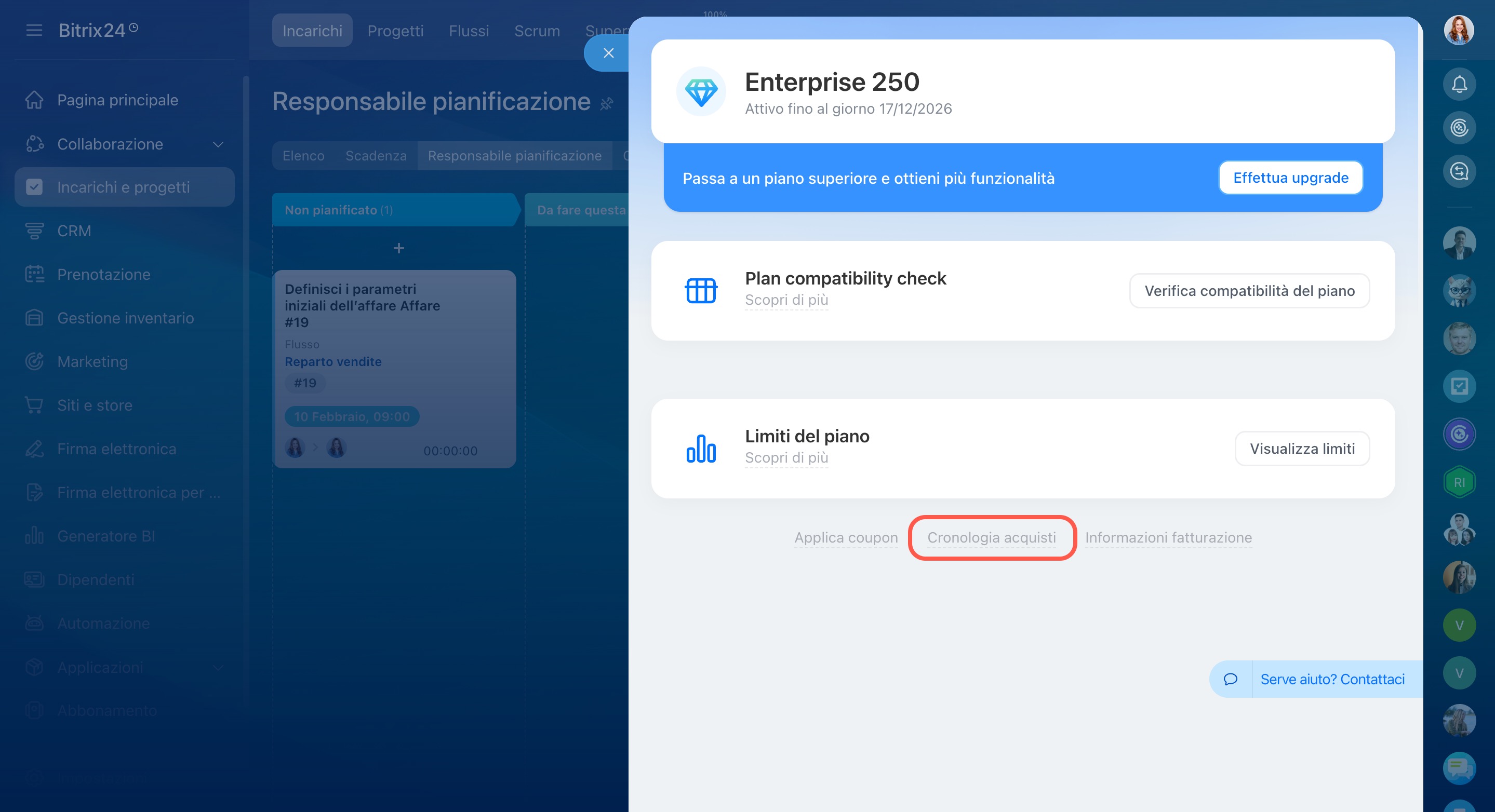 Se il rinnovo automatico non ha funzionato per il tuo account Bitrix24, ti consigliamo di controllare lo stato del rinnovo automatico del tuo abbonamento nella sezione Abbonamento > Cronologia acquisti.