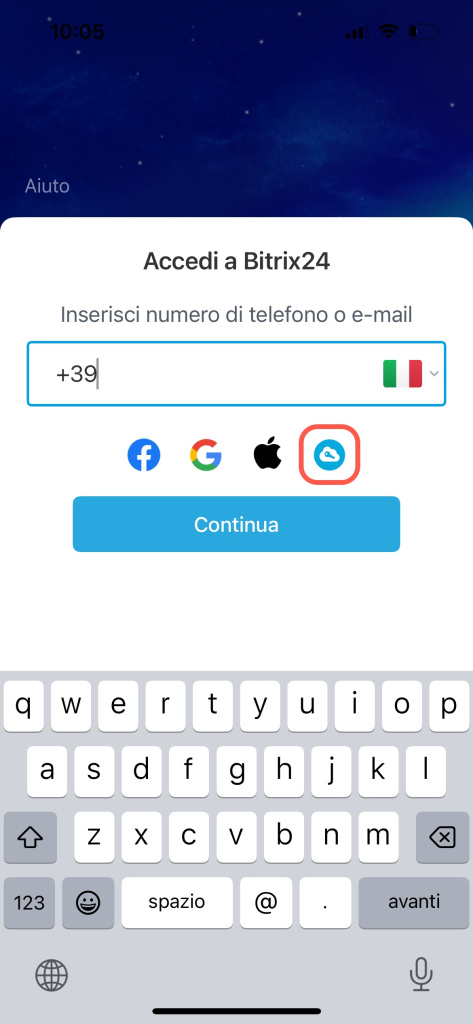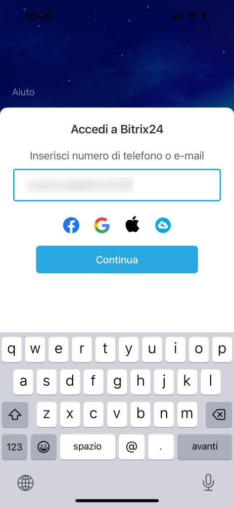 Nome utente nella versione Cloud di Bitrix24: è l'indirizzo e-mail, il numero di telefono o l'accesso al social network (Facebook, Google, ID Apple). Se tutti questi dati sono collegati a un account Bitrix24, puoi accedere con uno qualsiasi di essi.