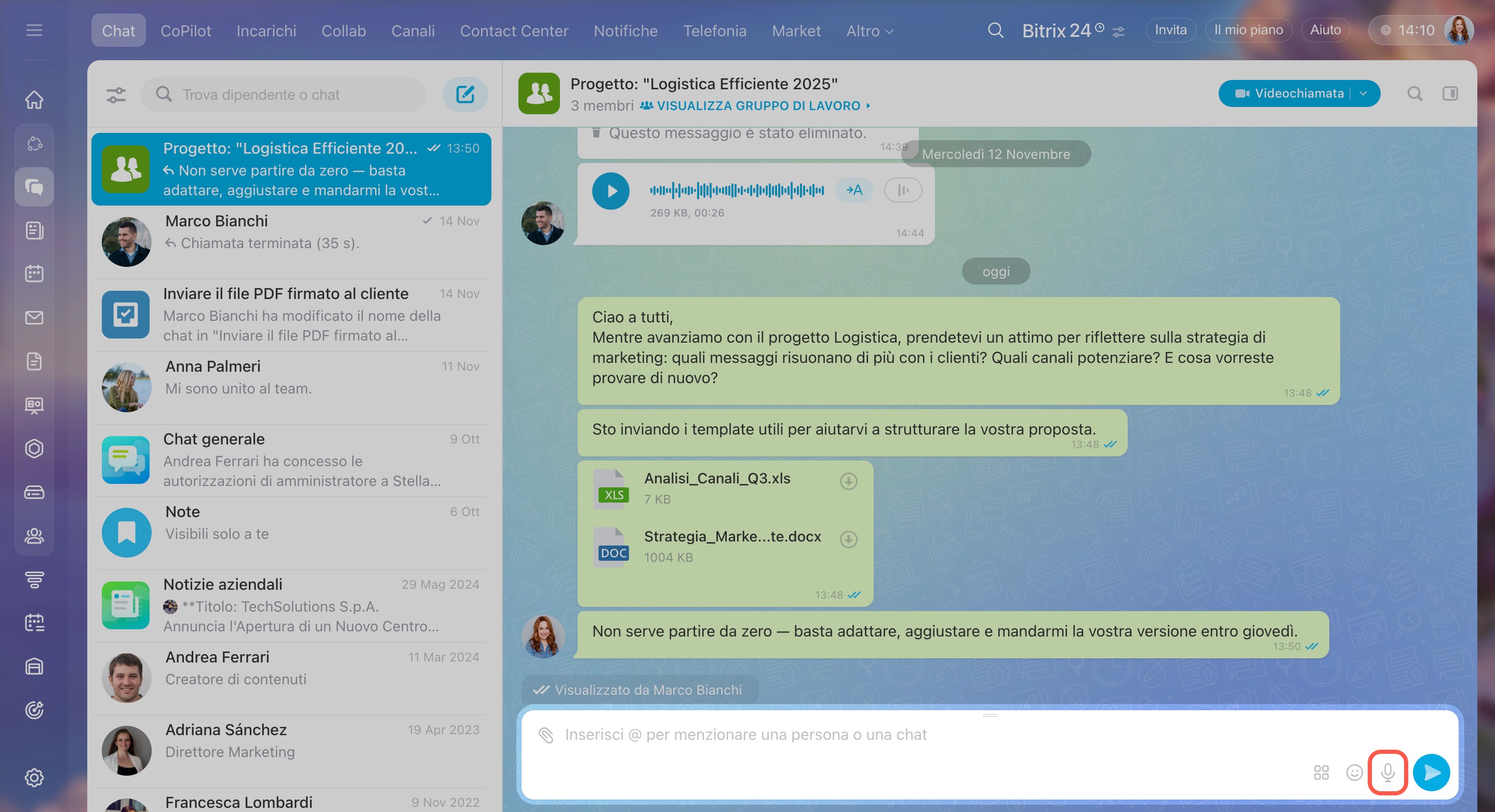 Bitrix24 Chat è uno strumento per la comunicazione di gruppo. Consente ai dipendenti di discutere rapidamente questioni lavorative, condividere file, creare incarichi e riunioni direttamente dalla conversazione.