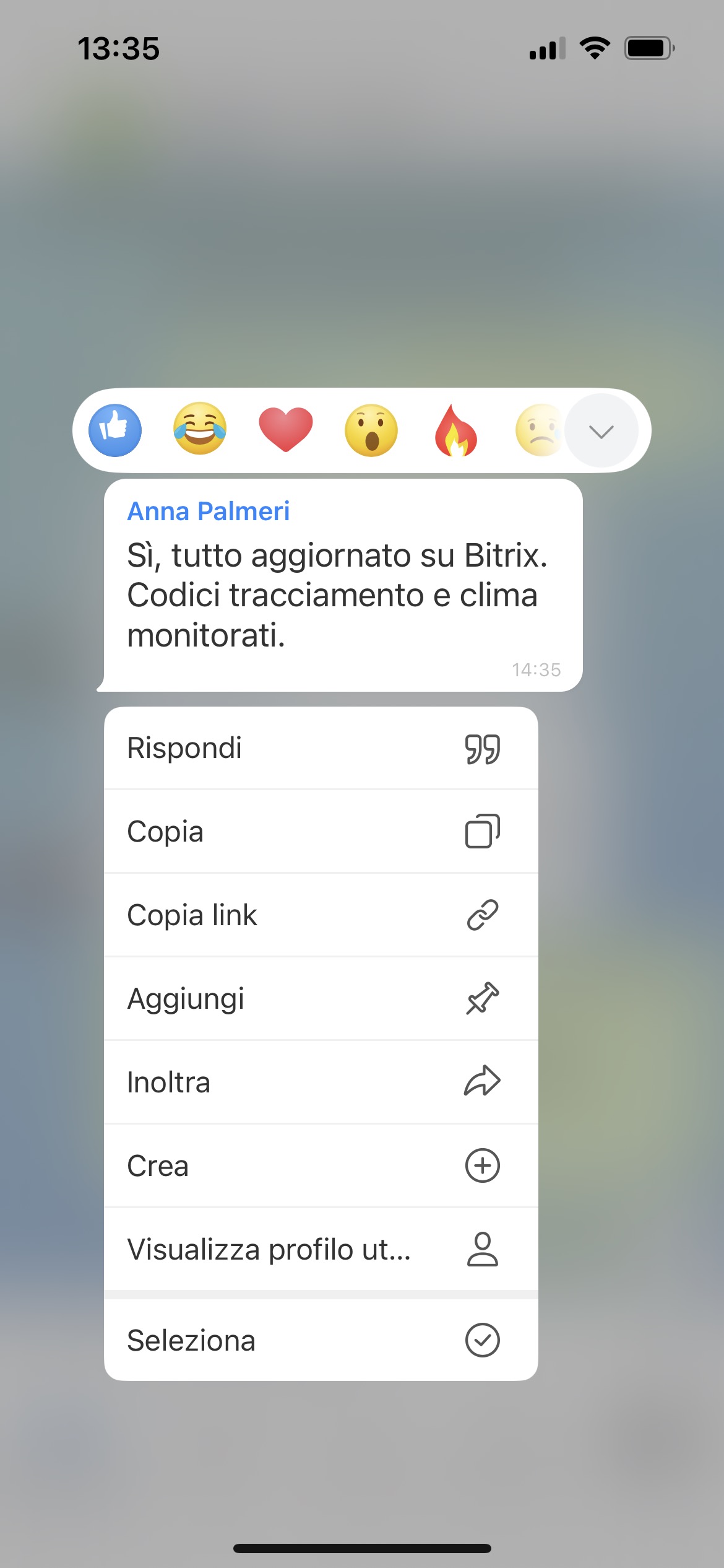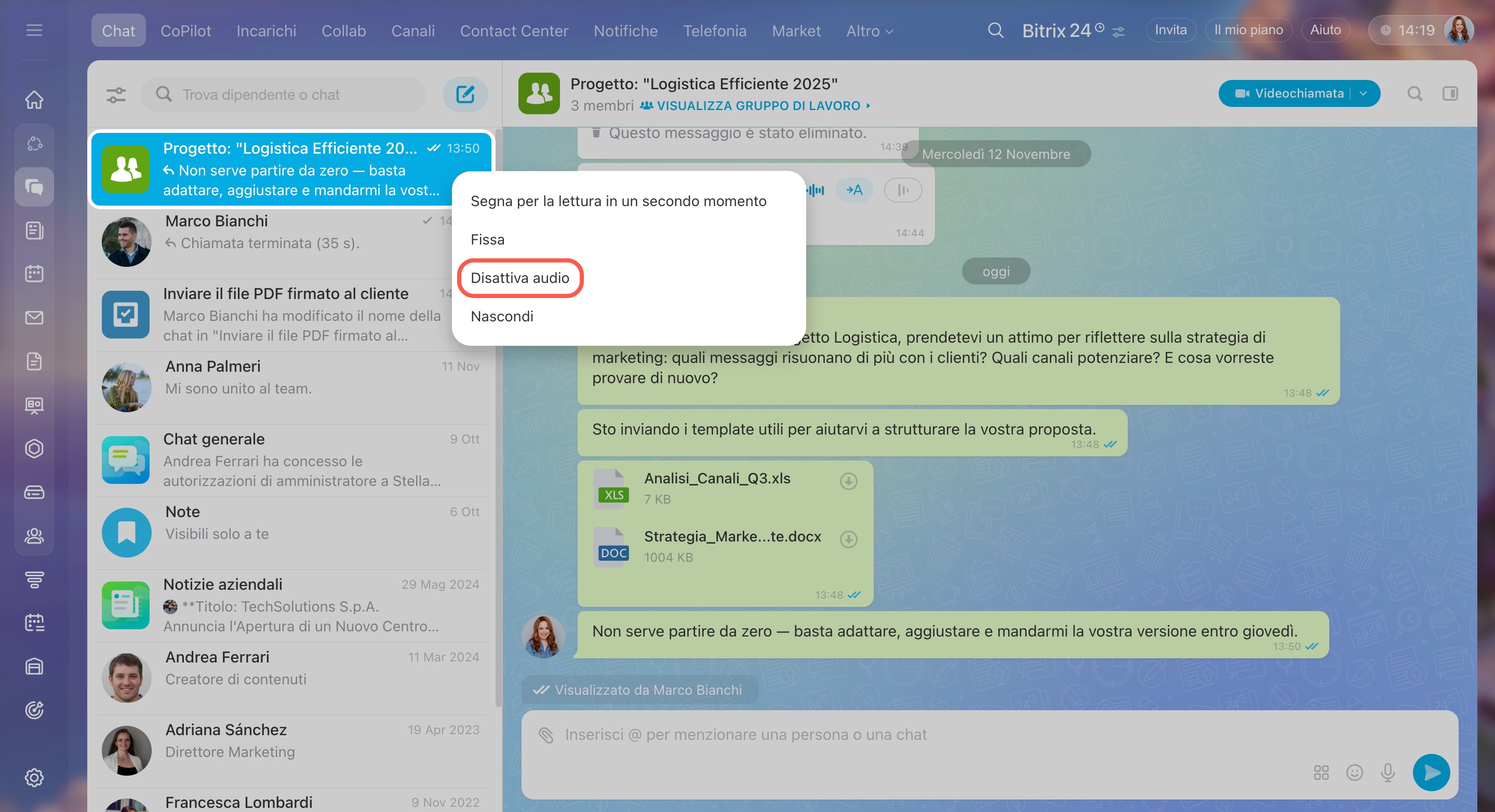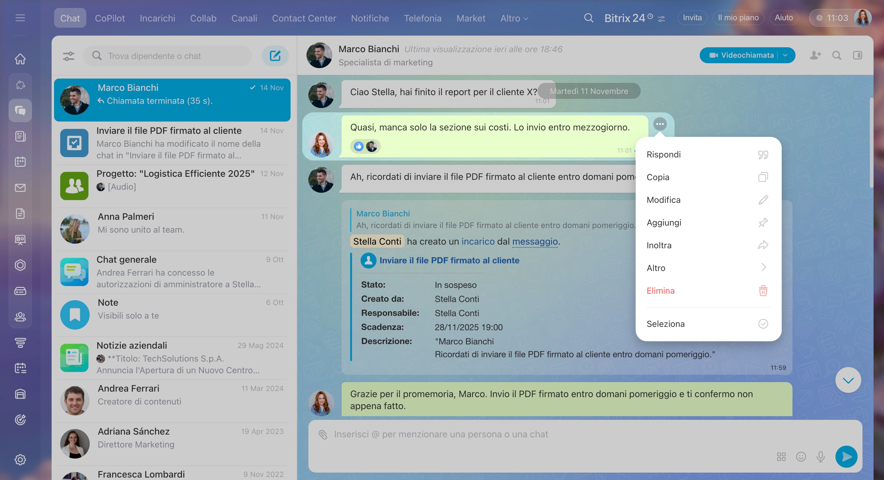 - Copia link — puoi inviarlo ai colleghi. Il messaggio sarà visibile se il collega è un partecipante della chat o se la chat è pubblica.
