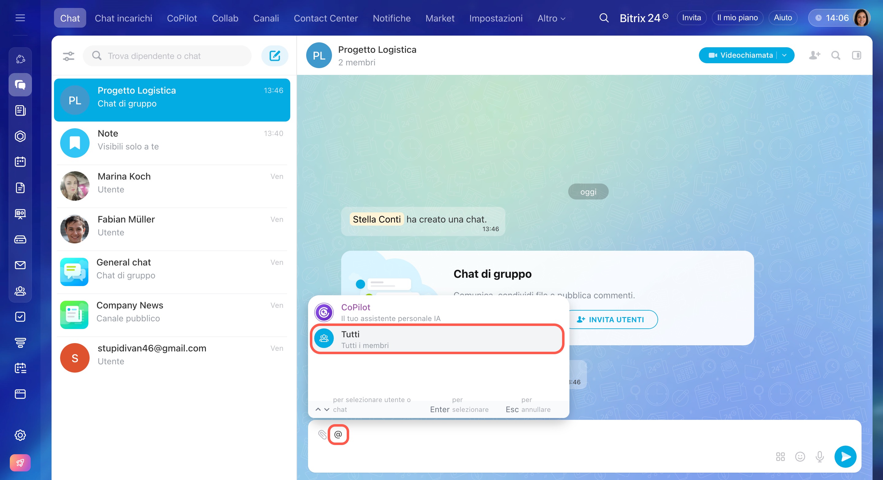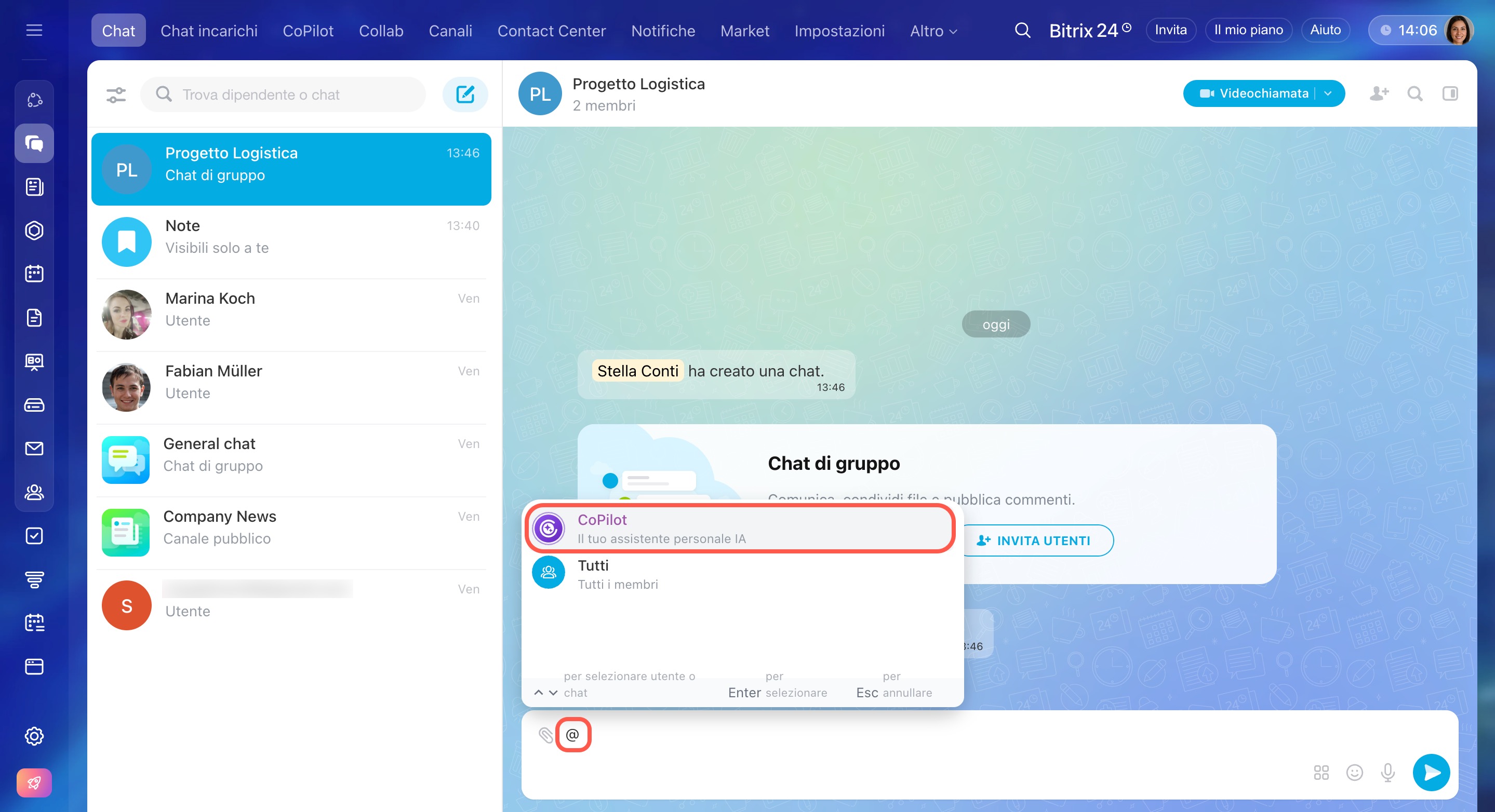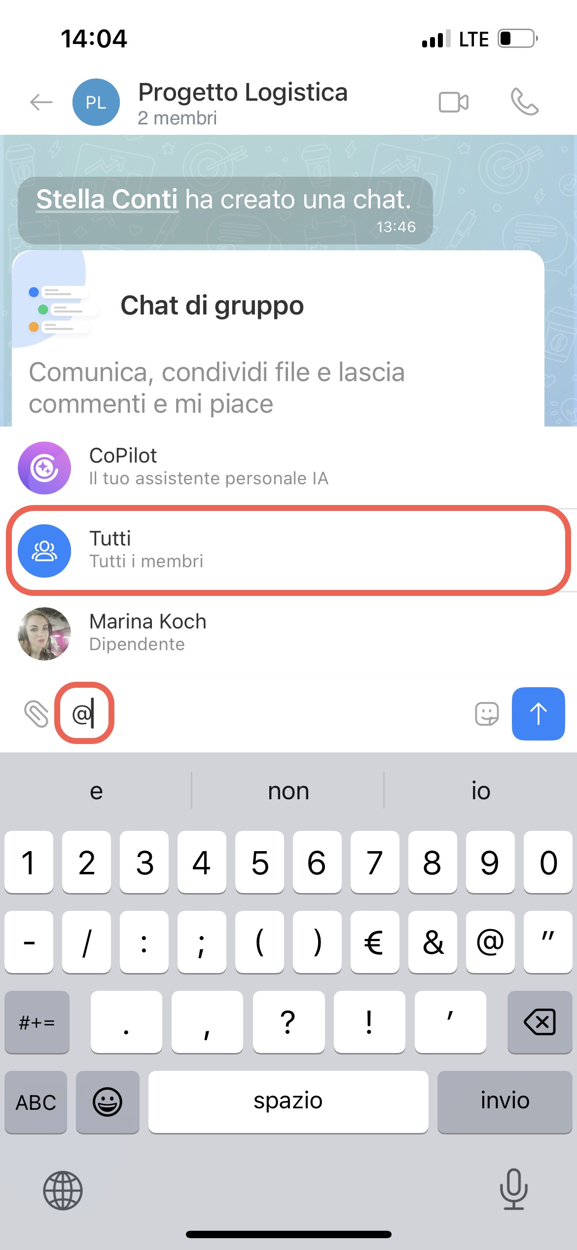 Menzionare CoPilot. Premi @ e seleziona CoPilot per fare una domanda o discutere un'idea direttamente nella chat o nel canale. L'AI ti aiuterà a comprendere rapidamente la conversazione — riassumerà, evidenzierà i punti principali e mostrerà l'essenza del discorso.