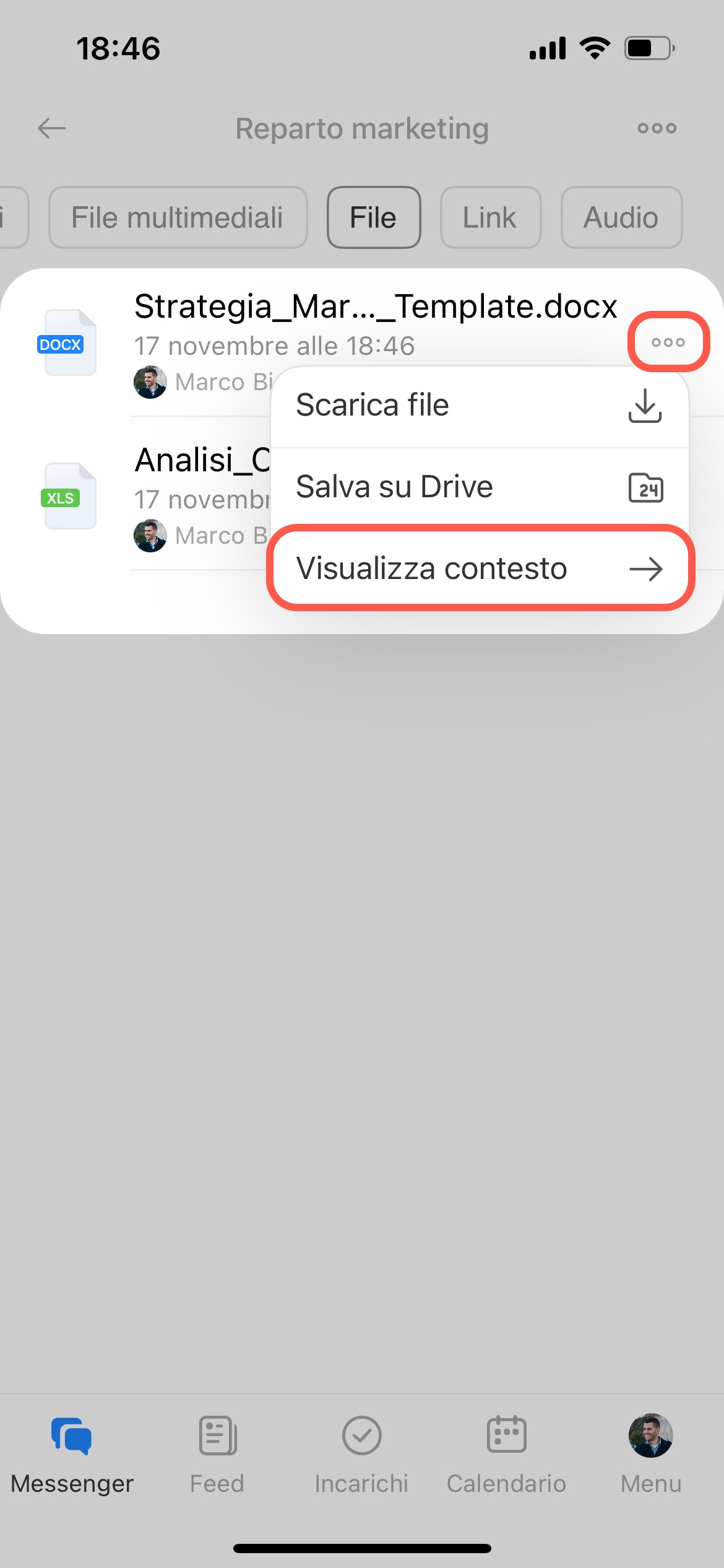 - Per accedere a un messaggio che ha portato alla creazione di un incarico o all'invio di un file, apri il menu contestuale dell'elemento: fai clic su Tre punti (...) > Visualizza contesto.