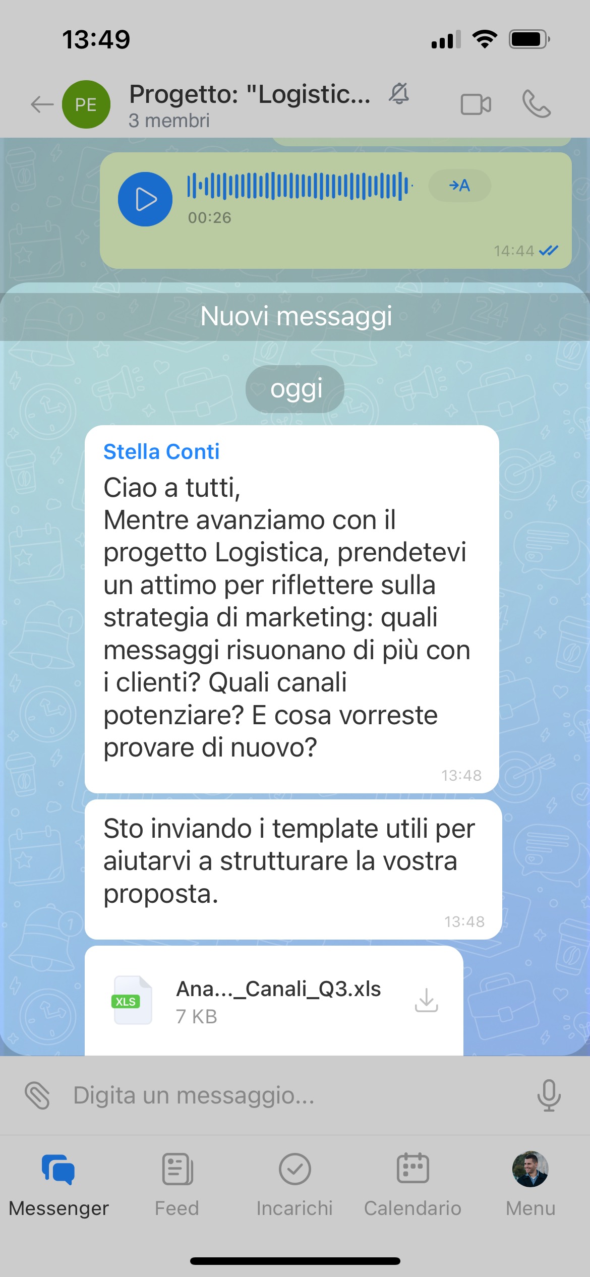 Nel Messenger sono disponibili chat personali e di gruppo, canali, collaborazioni, chat con CoPilot e videoconferenze. Puoi scegliere il tipo di chat più adatto per rendere la comunicazione comoda ed efficace.