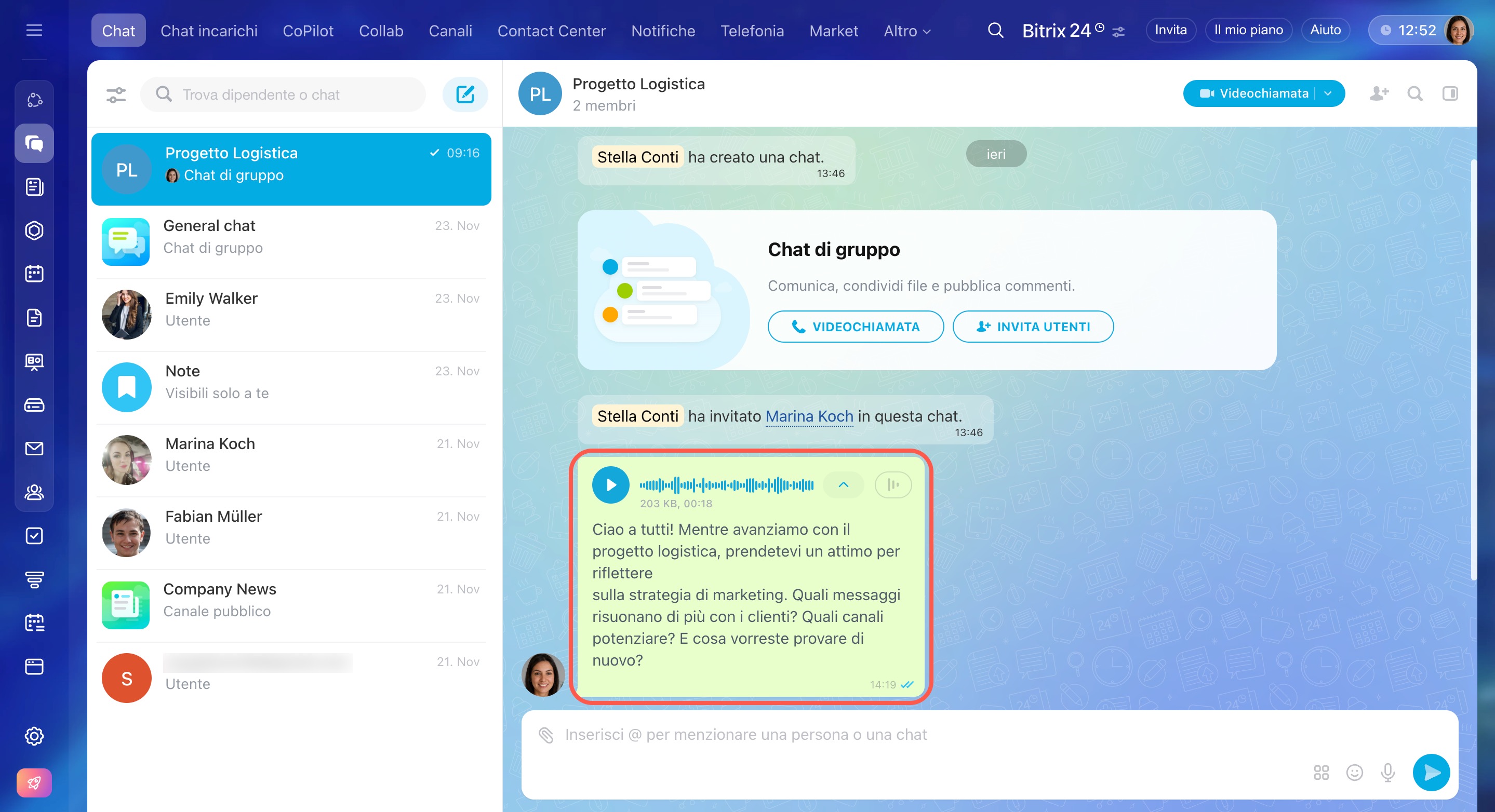 - Bitrix24 Chat è uno strumento per la comunicazione di gruppo. Consente ai dipendenti di discutere rapidamente questioni lavorative, condividere file, creare incarichi e riunioni direttamente dalla conversazione.