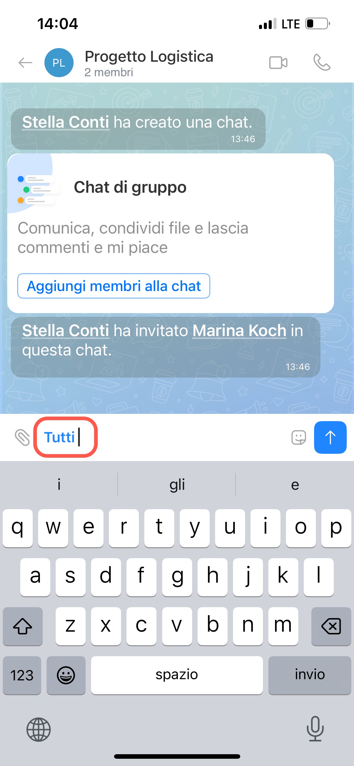 Menzionare un collega o una chat. Premi + o @, inizia a digitare il nome dell'utente o della chat e seleziona l'opzione appropriata dall'elenco. Nel messaggio verrà aggiunto un link alla chat: di gruppo o privata.