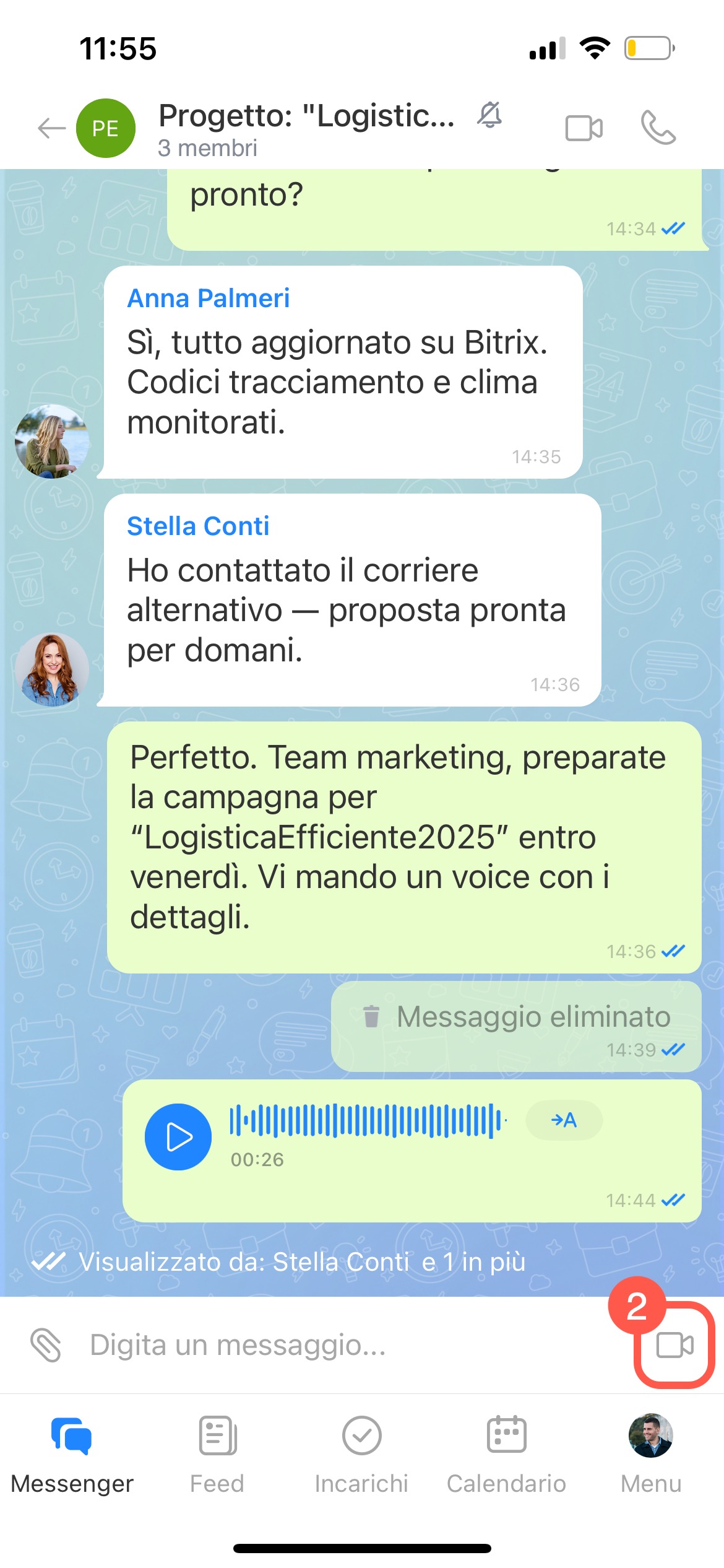 - Dalla chat puoi chiamare i colleghi tramite Bitrix24 Sync o una conferenza Zoom.