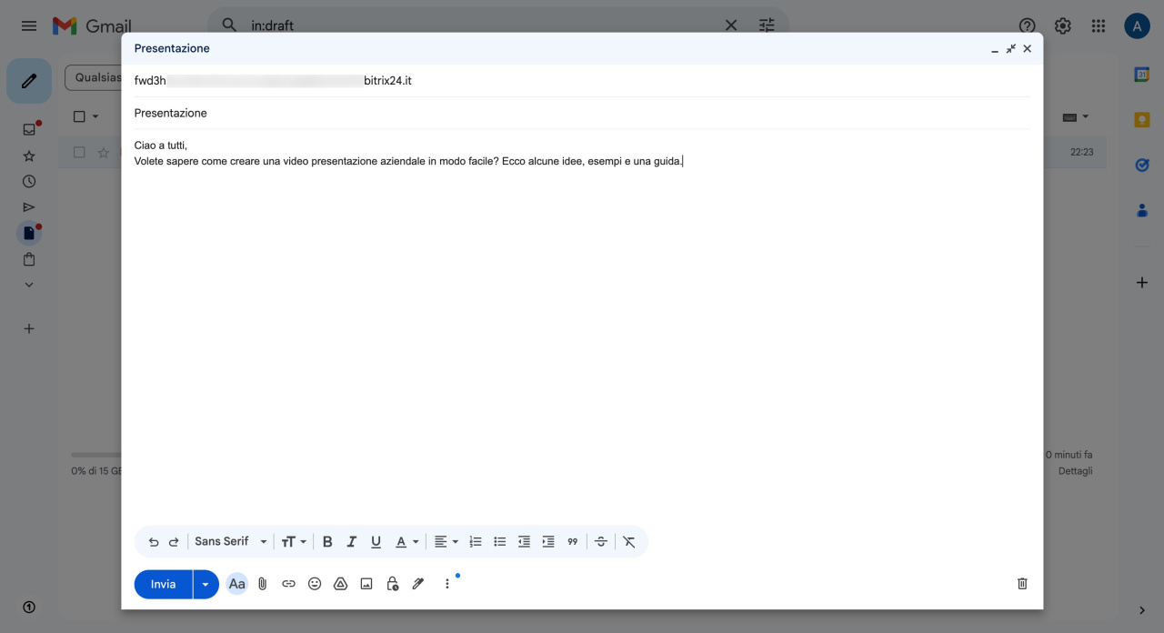 L'utente esterno dovrà inviare un'e-mail all'indirizzo specificato. Inserisci il nome dell'incarico nel campo Oggetto. Nel testo del messaggio aggiungi la descrizione dettagliata dell'incarico. Puoi anche allegare file fino a 14 MB.