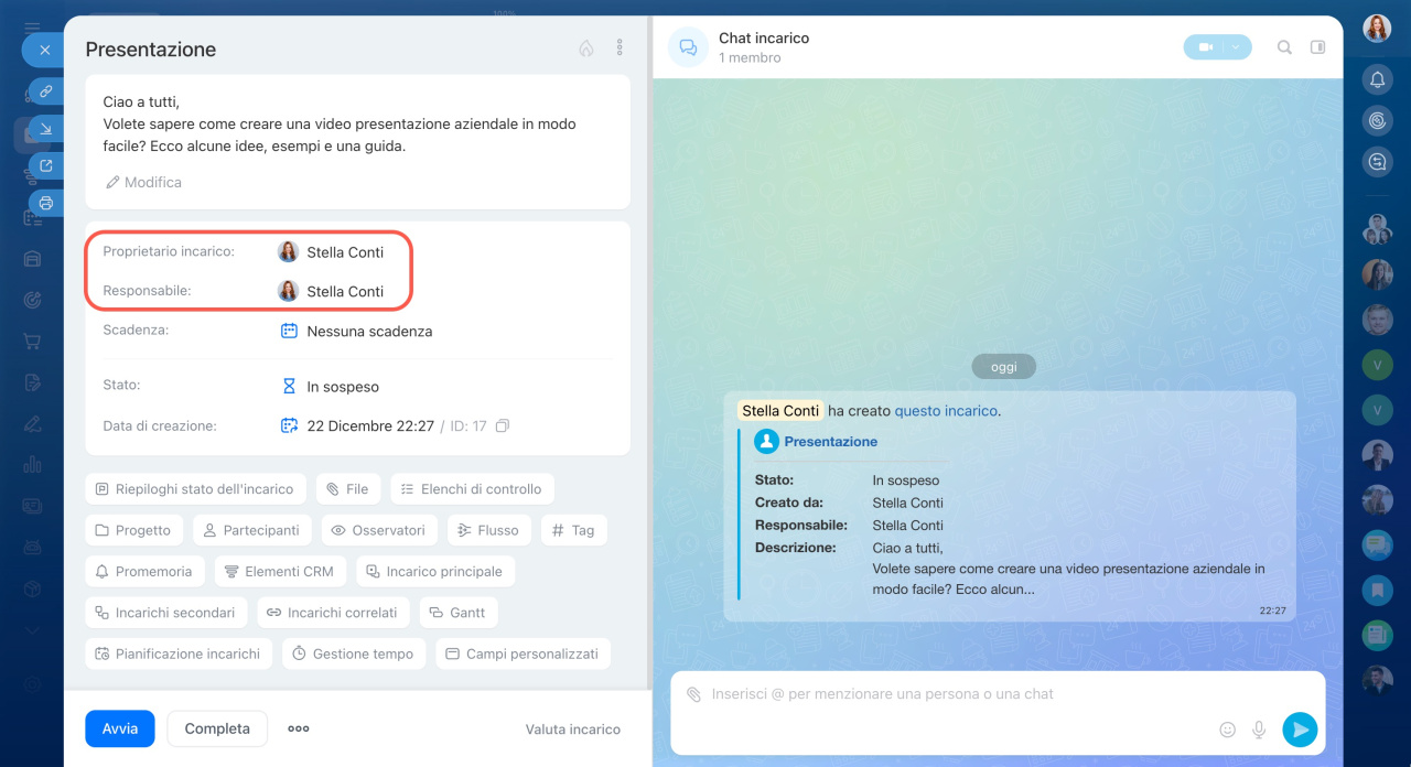 Una volta inviata l'e-mail, l'incarico apparirà nel tuo Bitrix24. Per impostazione predefinita, il dipendente dal cui account è stato copiato il link sarà il creatore e proprietario dell'incarico. I ruoli utente possono essere modificati.