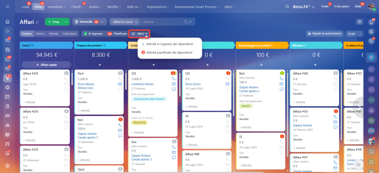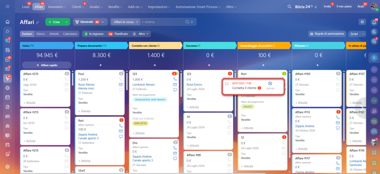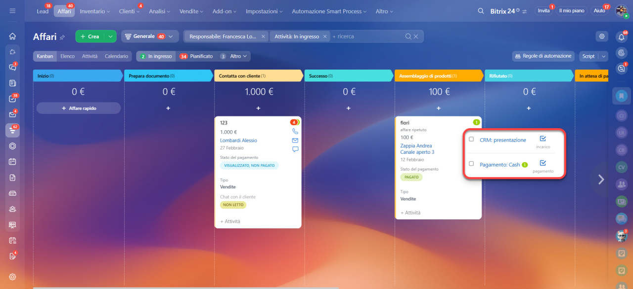 Lavorare con la visualizzazione "Attività" negli affari e nei lead