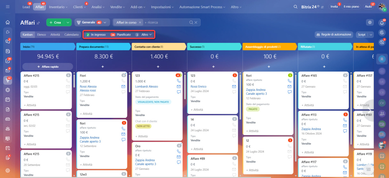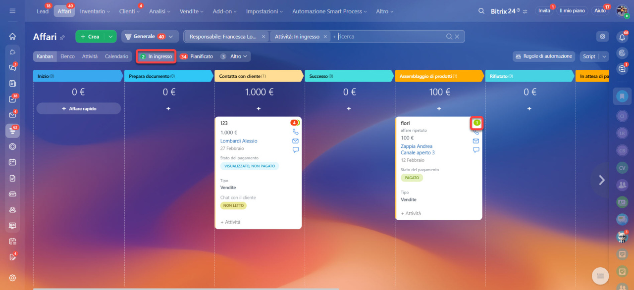 Il CRM ha due tipi di contatori: In ingresso e Pianificato.