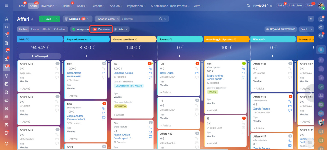 Il contatore Pianificato mostra affari/lead con le attività urgenti o scadute. Le attività urgenti includono le attività che sono scadute oggi o le attività che hanno una scadenza di 15 minuti.