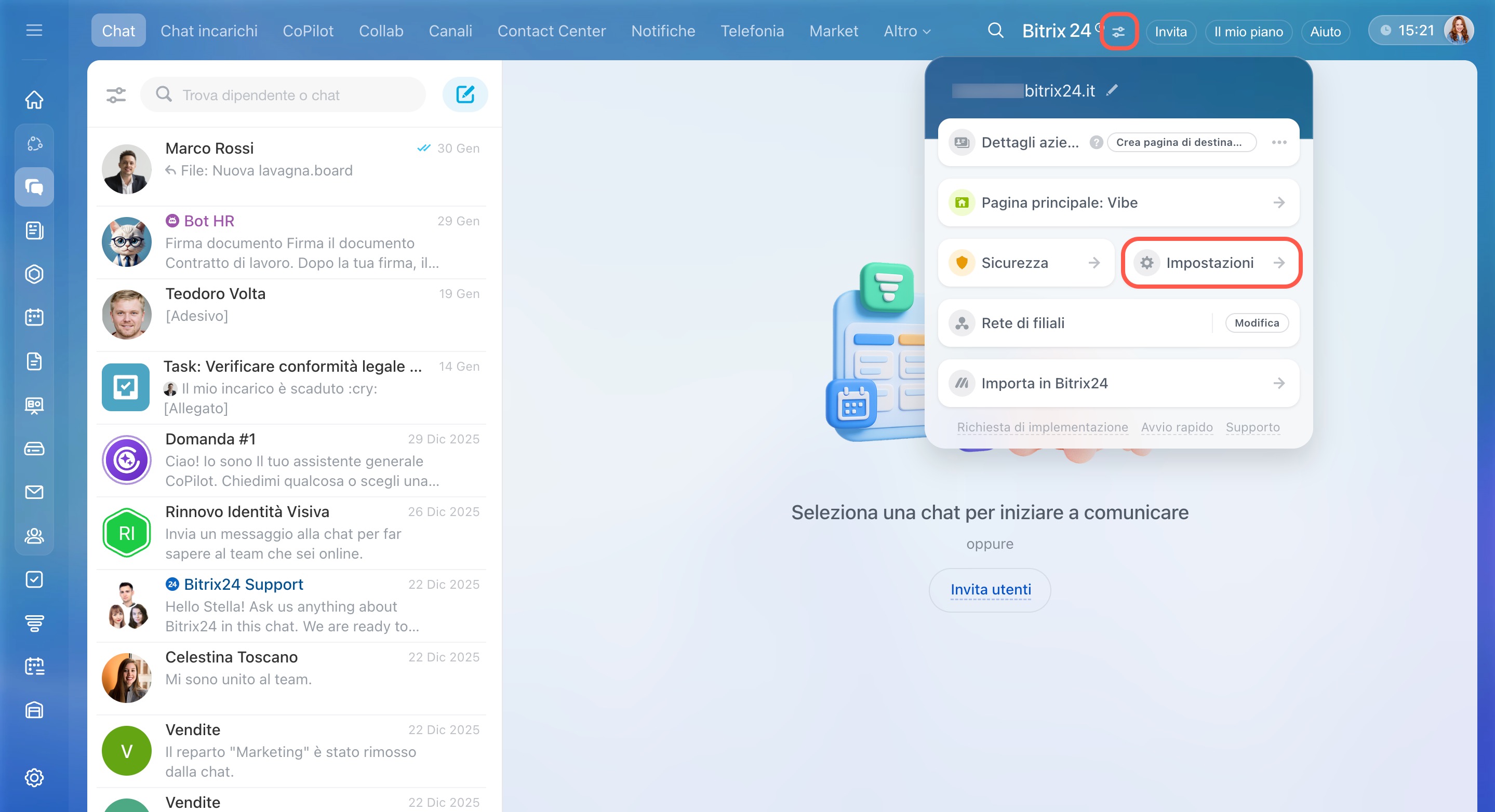 Fai clic sul widget in alto a destra e seleziona Impostazioni > Mio Bitrix24.