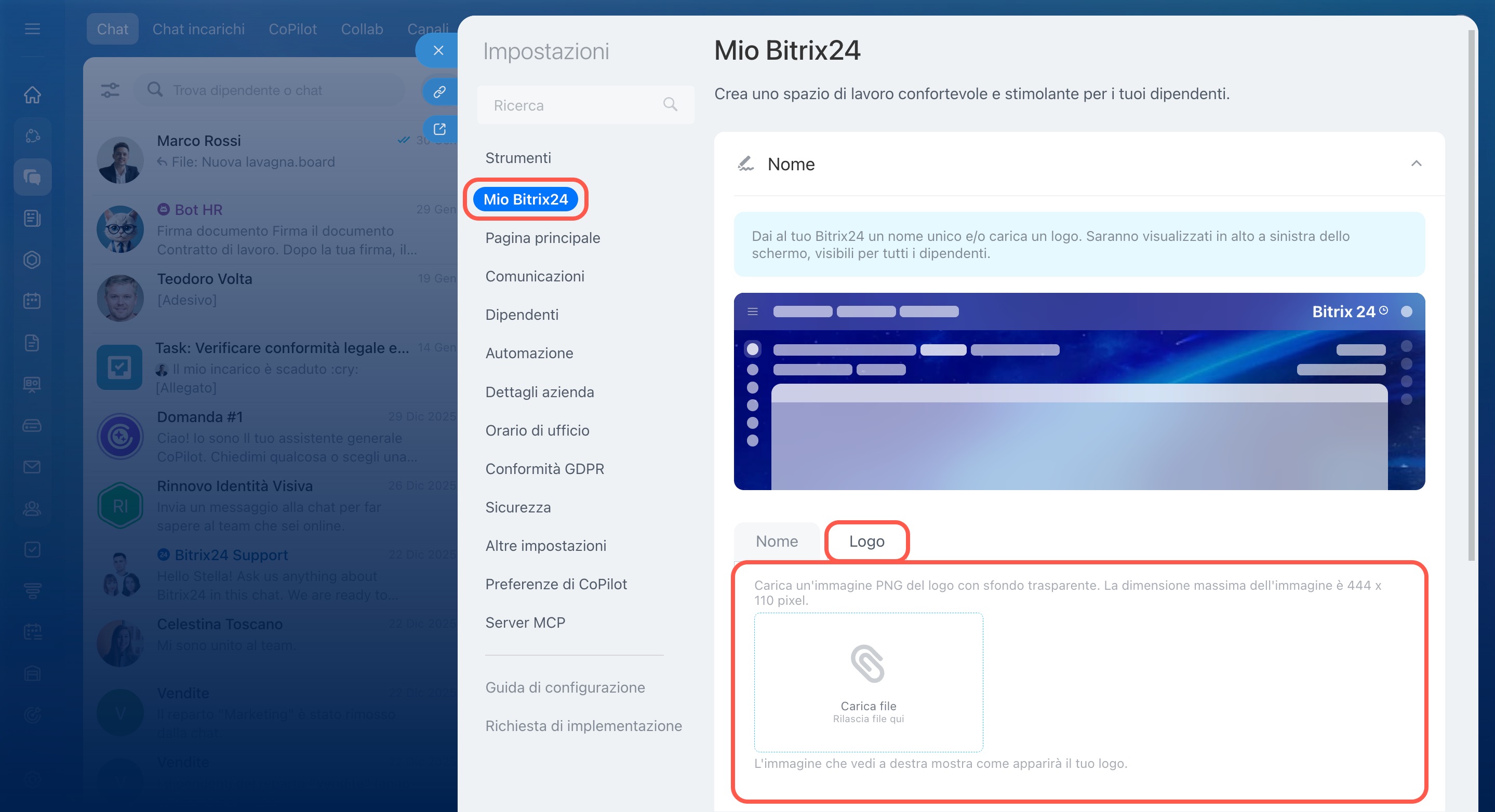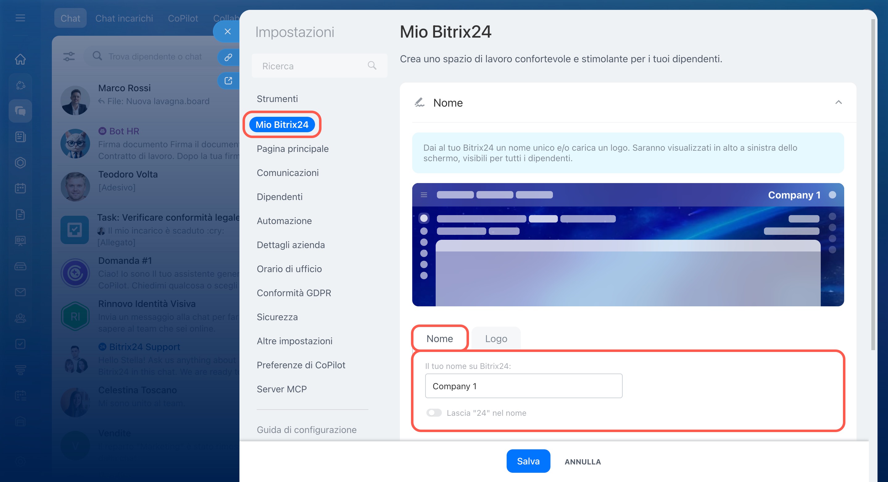 Bitrix24 è uno spazio unico di lavoro per i dipendenti. Personalizzalo per riflettere il tuo marchio sostituendo Bitrix24 con il nome o il logo della tua azienda.