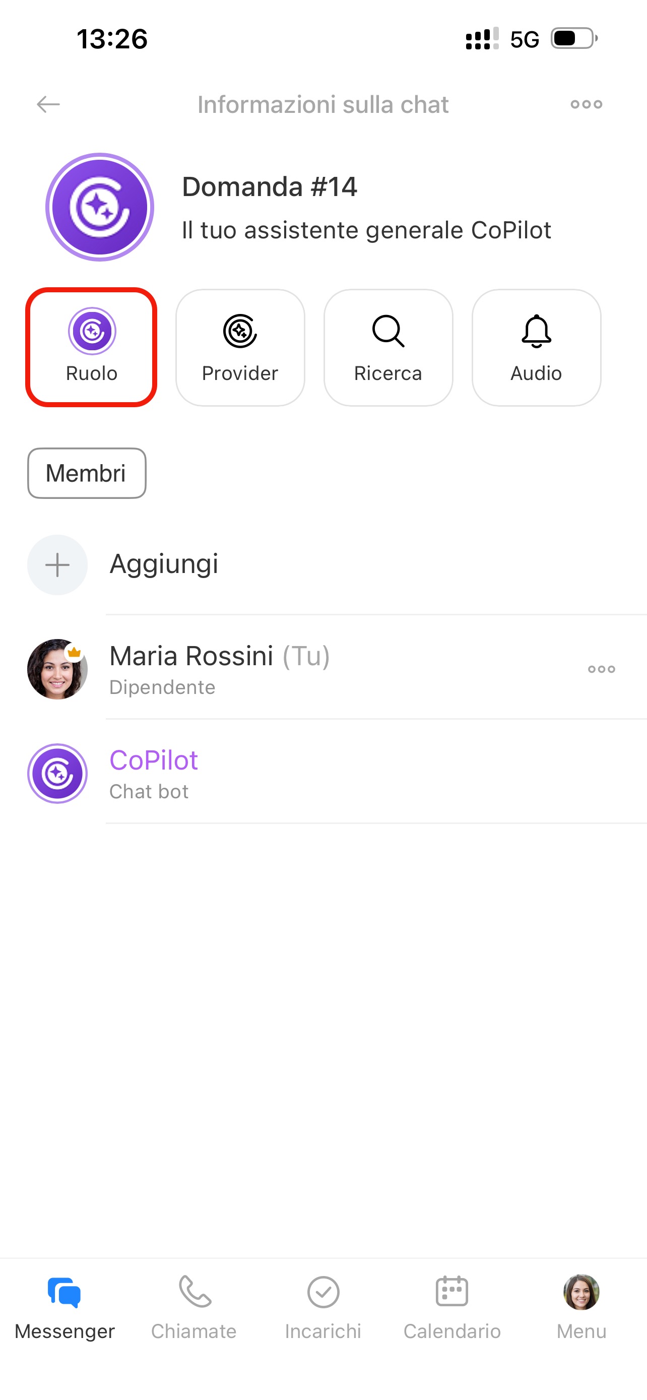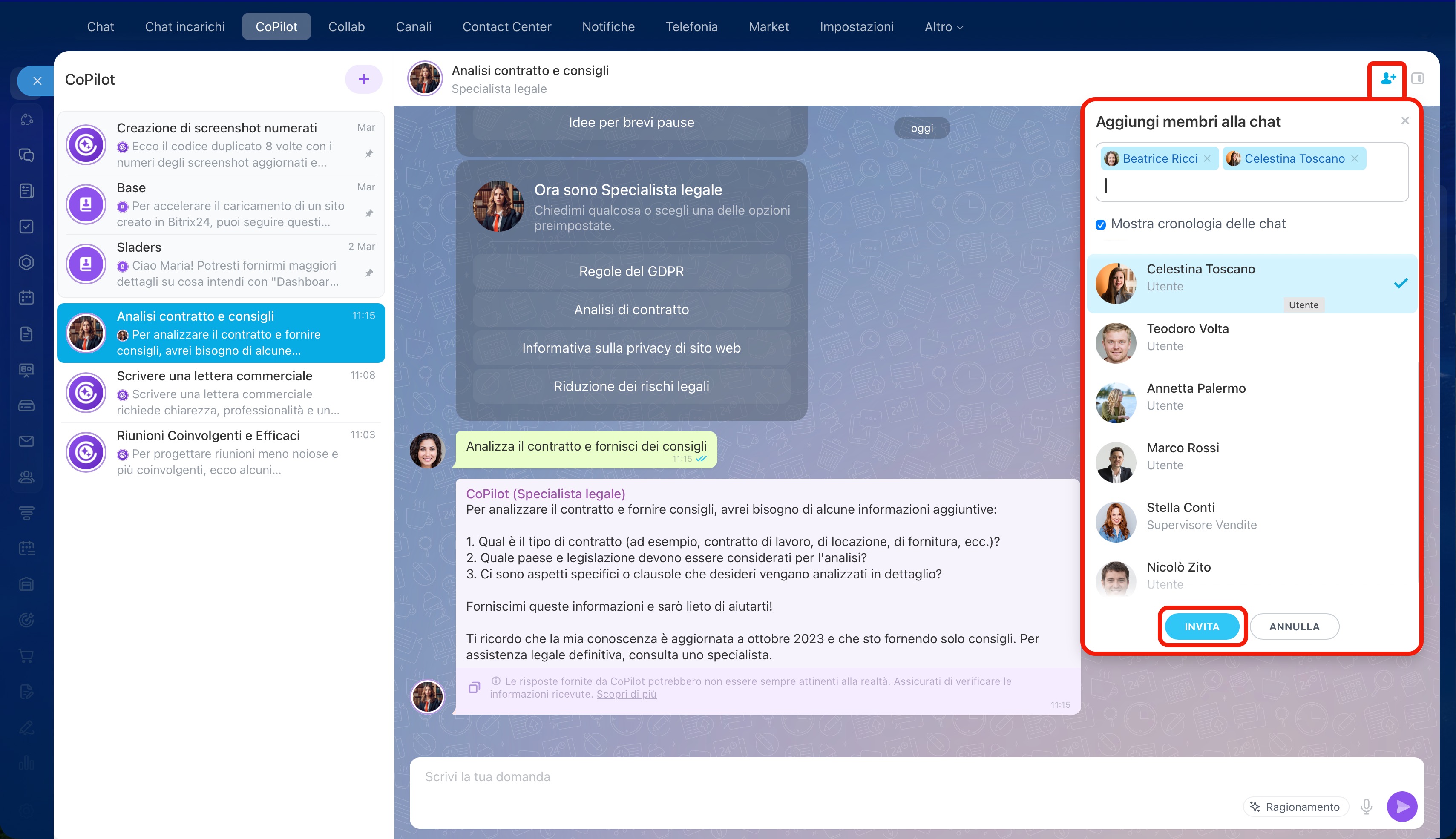 È possibile aggiungere partecipanti alla chat durante la creazione di una nuova chat o durante la comunicazione con CoPilot.