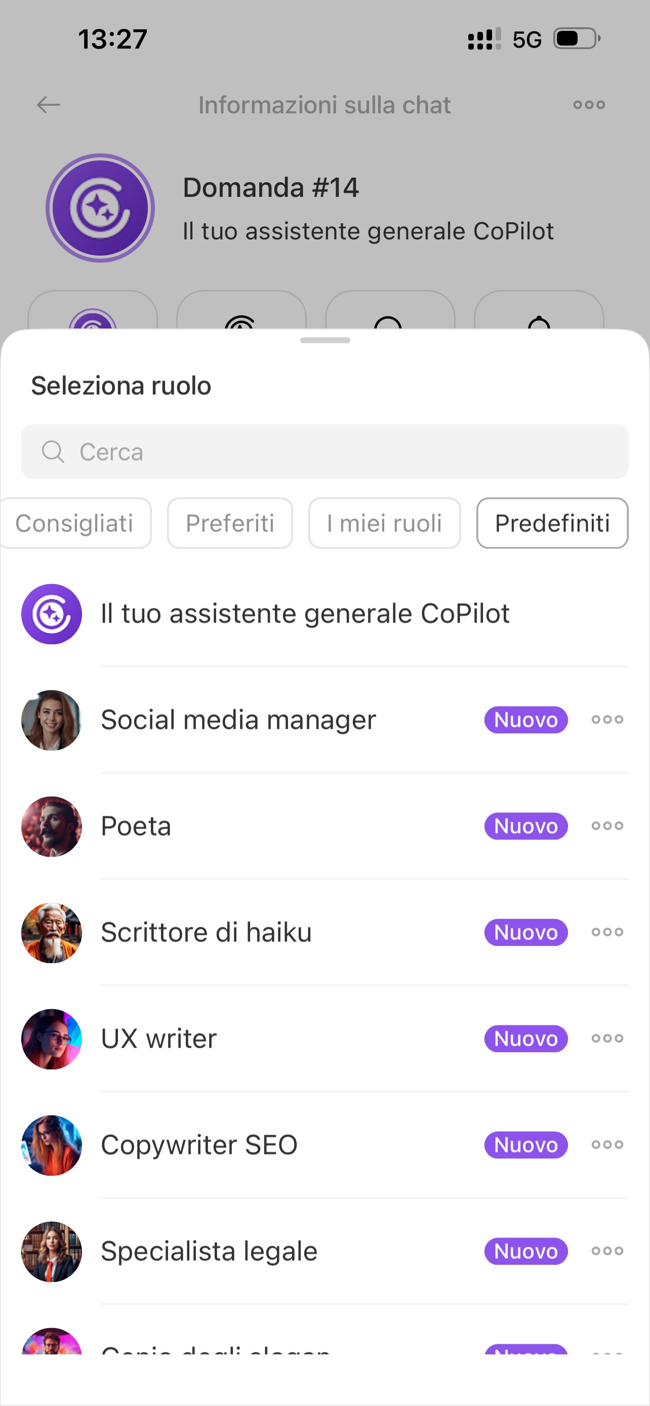 È possibile selezionare il ruolo durante la comunicazione con CoPilot. I ruoli sono suddivisi in categorie a seconda delle aree di attività. Clicca sul nome della chat per aprire la barra laterale e seleziona Ruolo. Per avviare rapidamente una conversazione e vedere come risponde CoPilot in un ruolo specifico, utilizza un prompt già pronto.