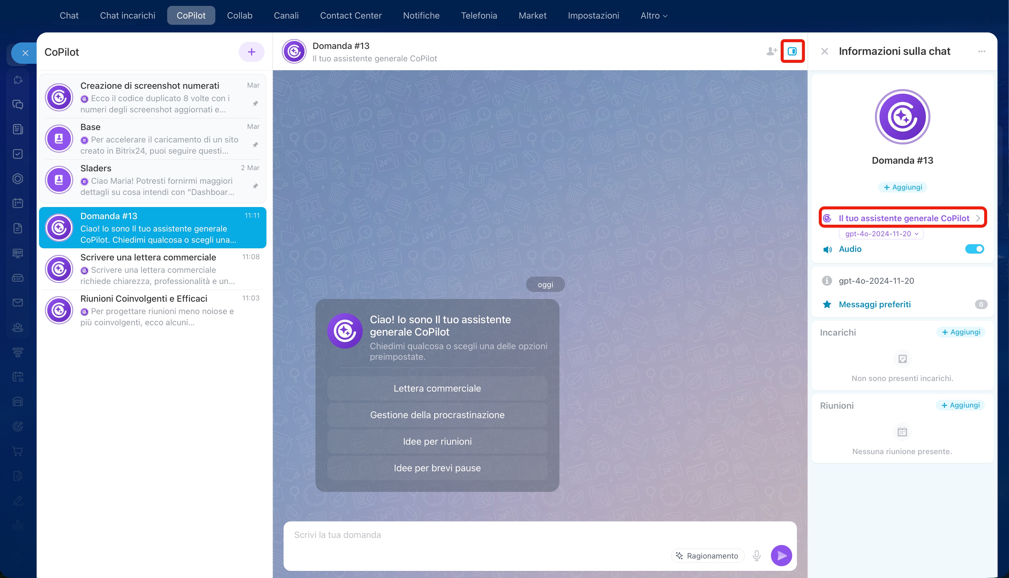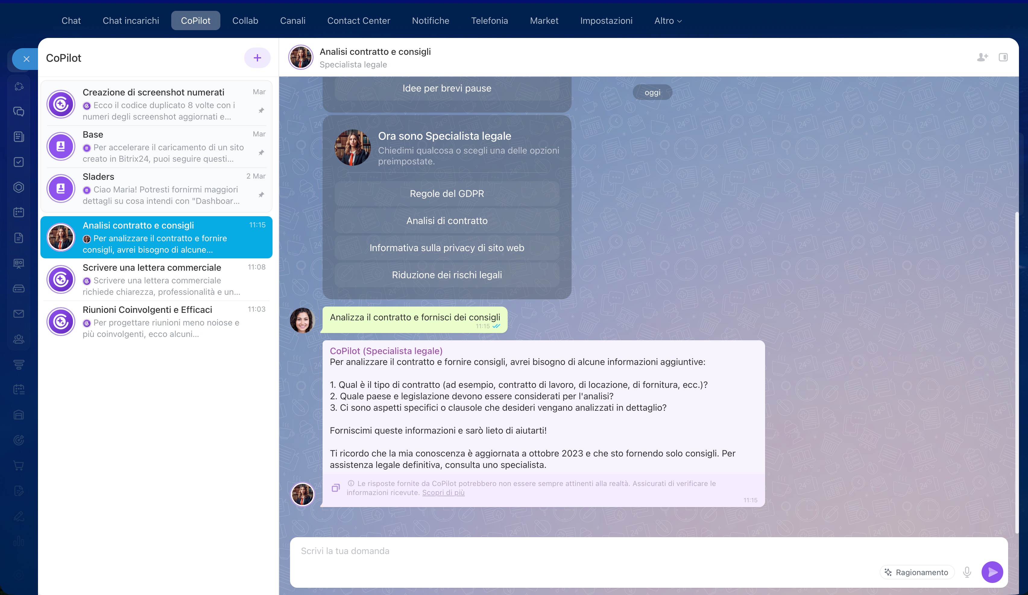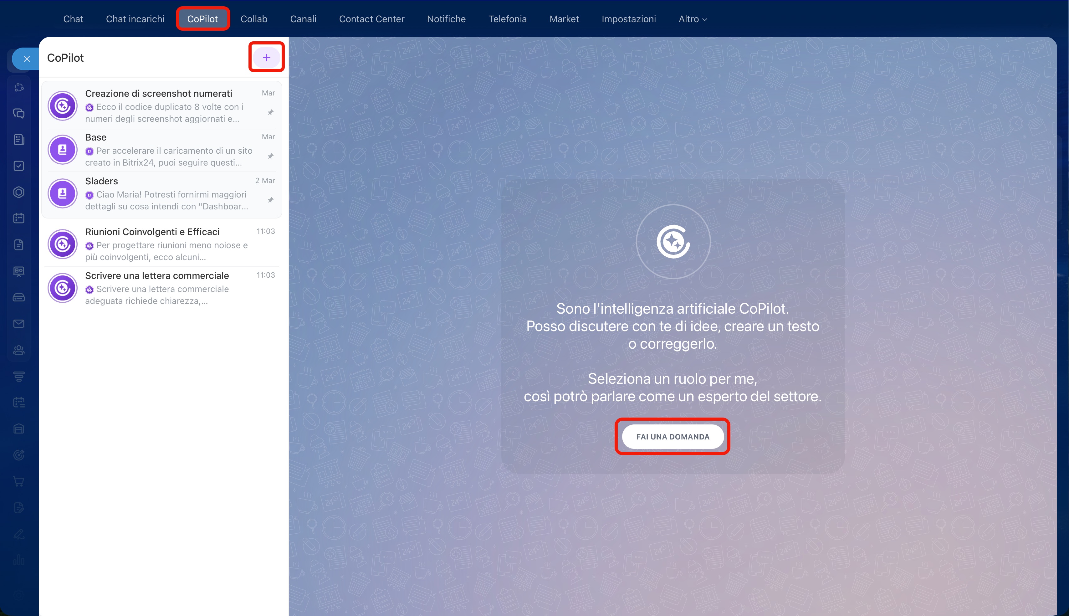 In Bitrix24, puoi interagire con CoPilot in una chat separata o interagire con lui da qualsiasi altra chat. CoPilot ti aiuta a rispondere a domande e a gestire una vasta gamma di incarichi.