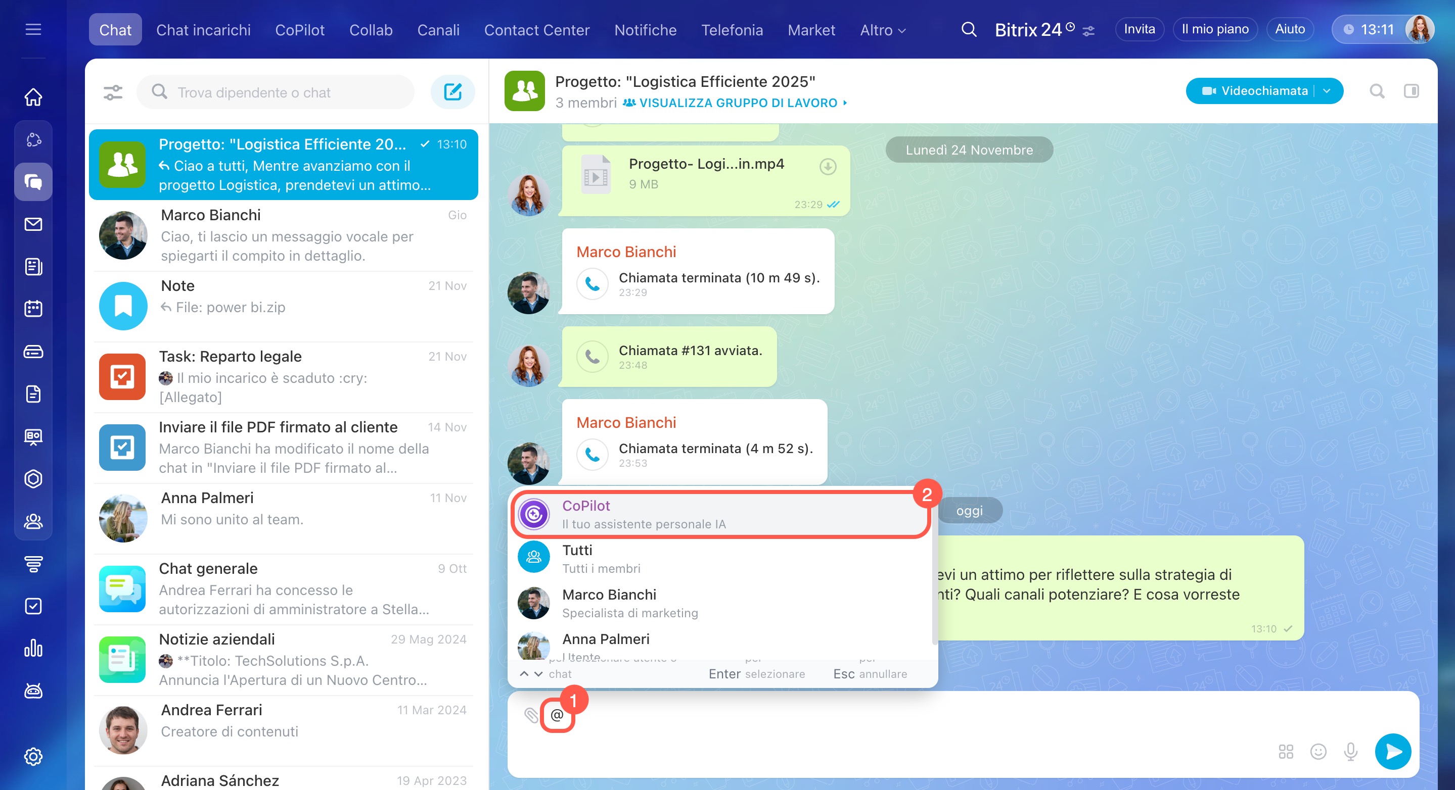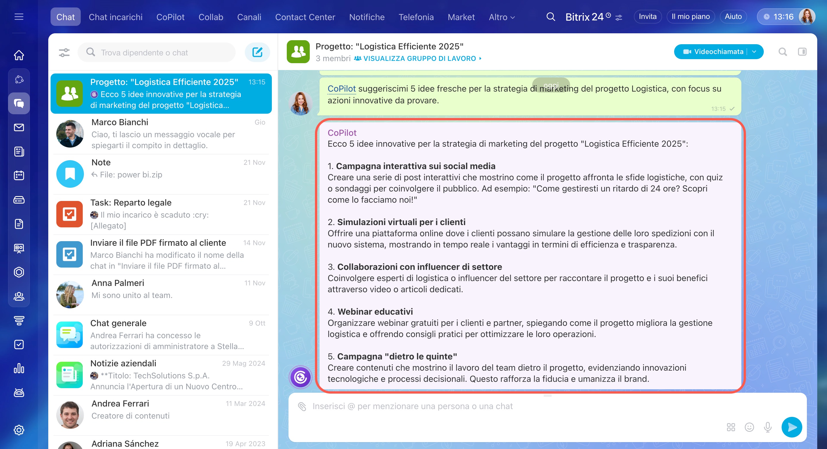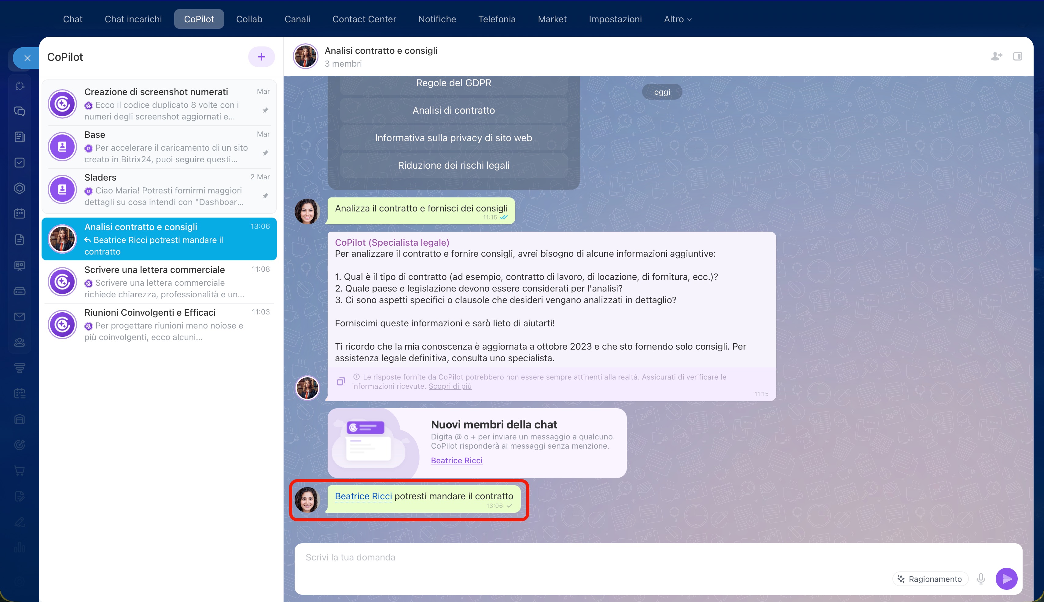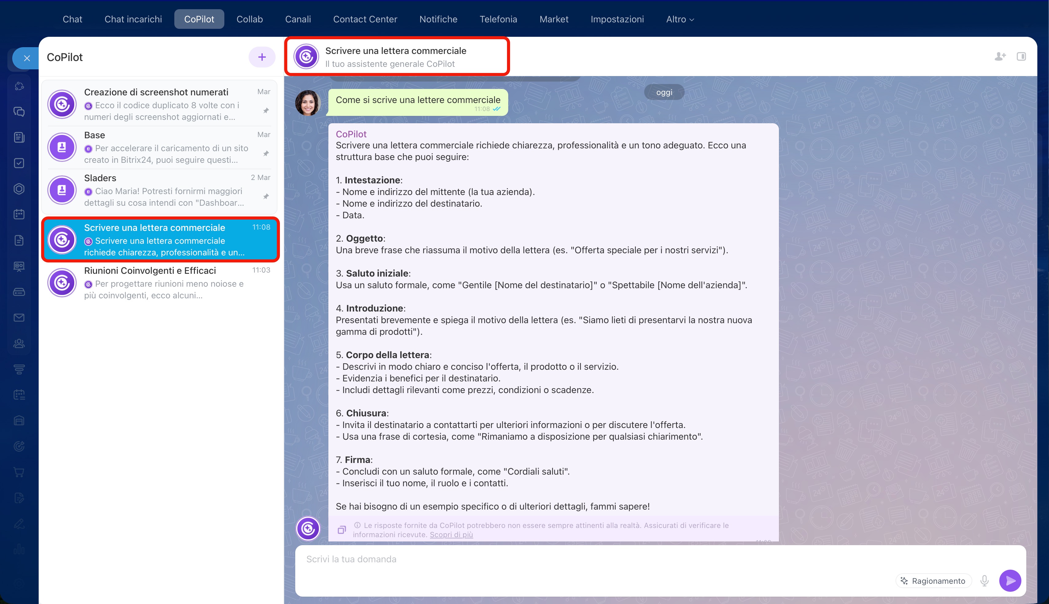 In Bitrix24, puoi interagire con CoPilot in una chat separata o interagire con lui da qualsiasi altra chat. CoPilot ti aiuta a rispondere a domande e a gestire una vasta gamma di incarichi.