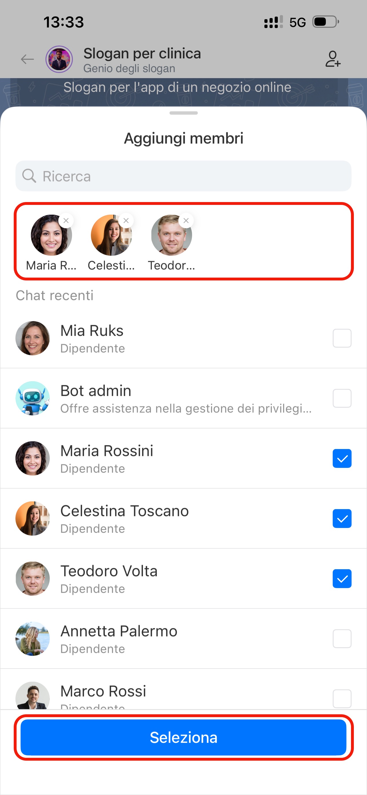 Fai clic sul pulsante Aggiungi membri alla chat > seleziona dipendenti > fai clic su Fatto.