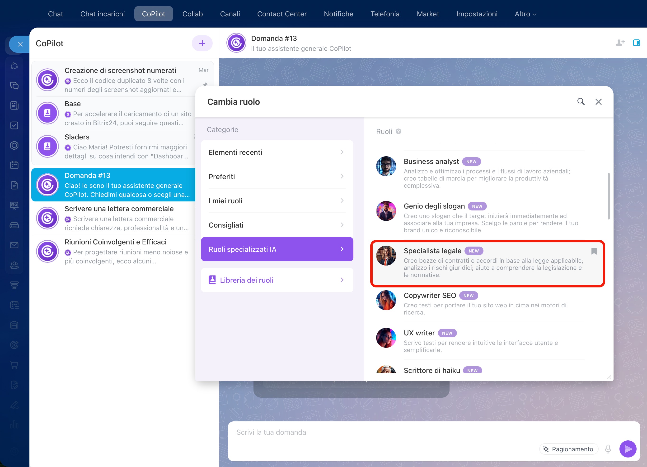 Durante la chat con CoPilot, seleziona il ruolo desiderato dalla barra laterale. Clicca sull'icona CoPilot per accedere all'elenco dei ruoli, organizzati per aree di attività. Ad esempio, attiva lo Specialista Legale per analizzare rischi normativi o comprendere le disposizioni applicabili alla tua attività.