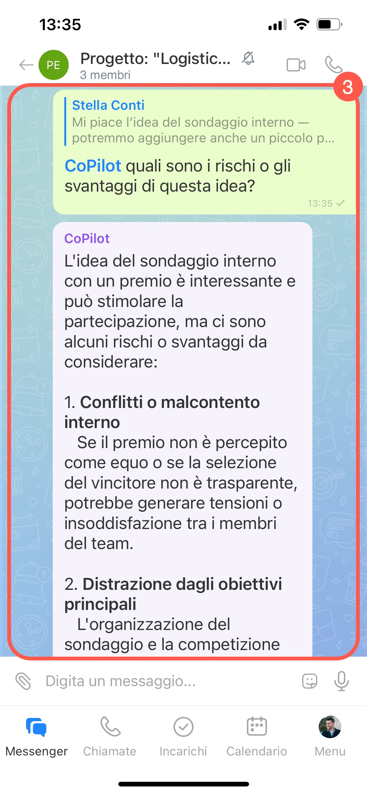 - Nel campo di testo apparirà il messaggio citato e il riferimento a CoPilot. Aggiungi la tua domanda e l'IA risponderà direttamente nella chat.