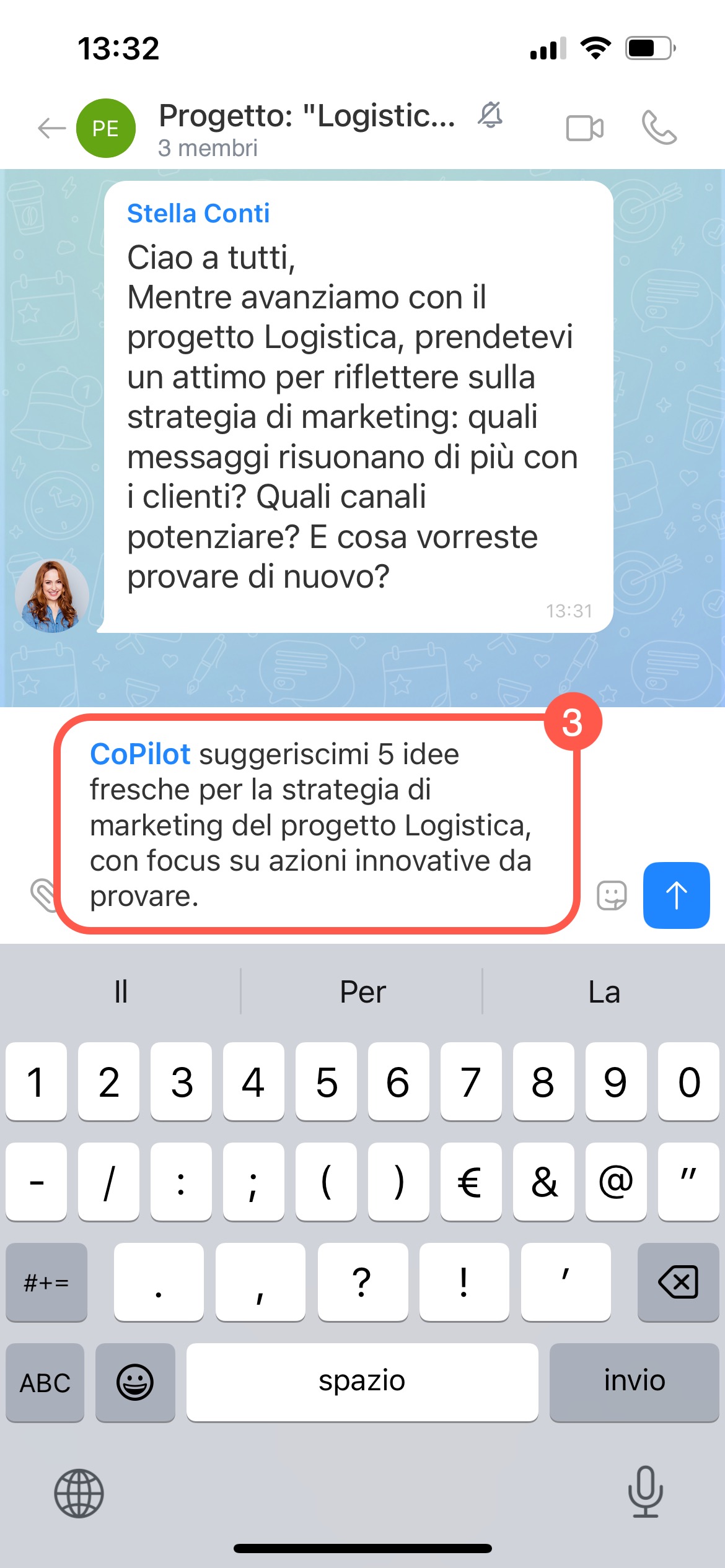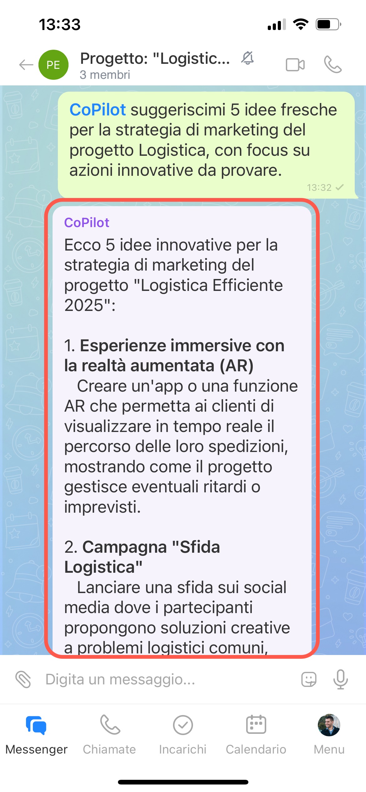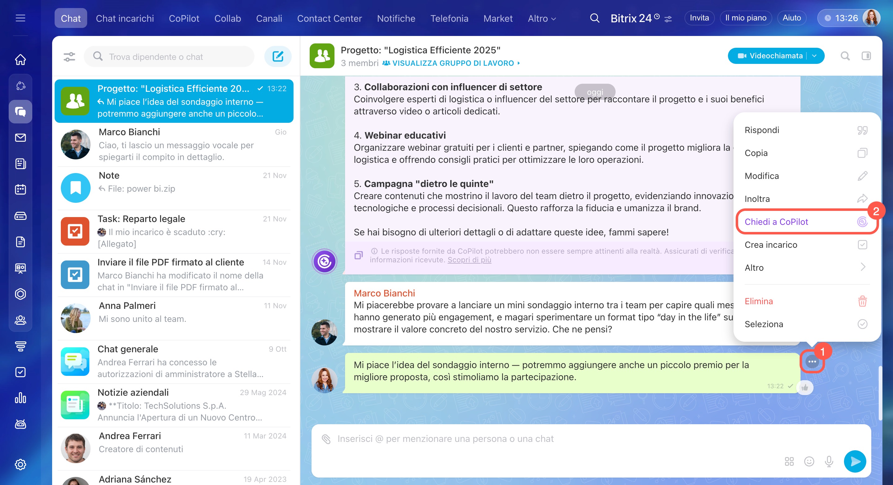 - Rivolgiti a CoPilot in qualsiasi chat, collab o nei commenti a un post nel canale. L'IA ti aiuterà a comprendere rapidamente la conversazione, proporrà opzioni di azione e supporterà la discussione direttamente nella chat.