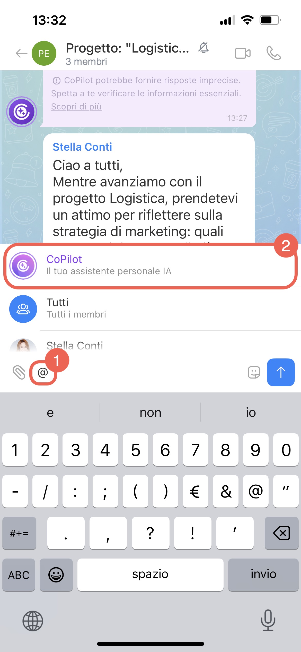 Quando scrivi a un collega nella chat di CoPilot, assicurati di menzionarlo. Per fare ciò, premi + o @ e poi inserisci il nome del dipendente. CoPilot risponderà a tutti i messaggi senza menzionare una persona specifica in questa chat.