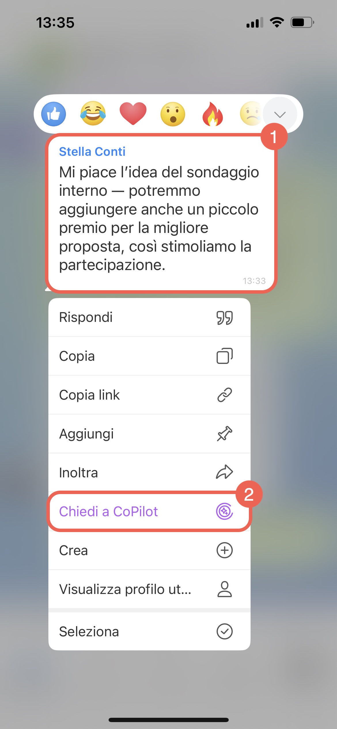 Interagire con CoPilot è semplice: puoi scrivere un nuovo messaggio o usare il menu contestuale su un messaggio già inviato.