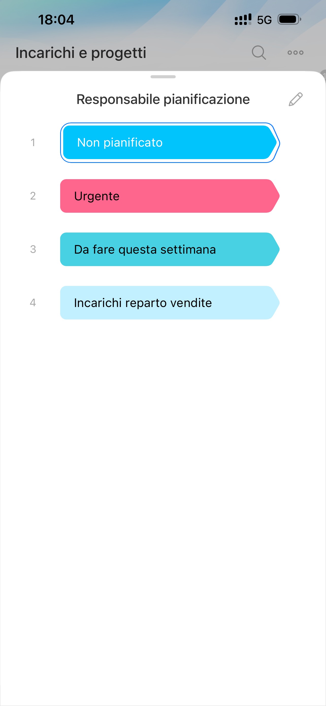 La visualizzazione incarichi "Responsabile pianificazione" è composta da fasi che crei tu stesso. Puoi suddividerle per tipologia, fasi di lavoro o reparti.