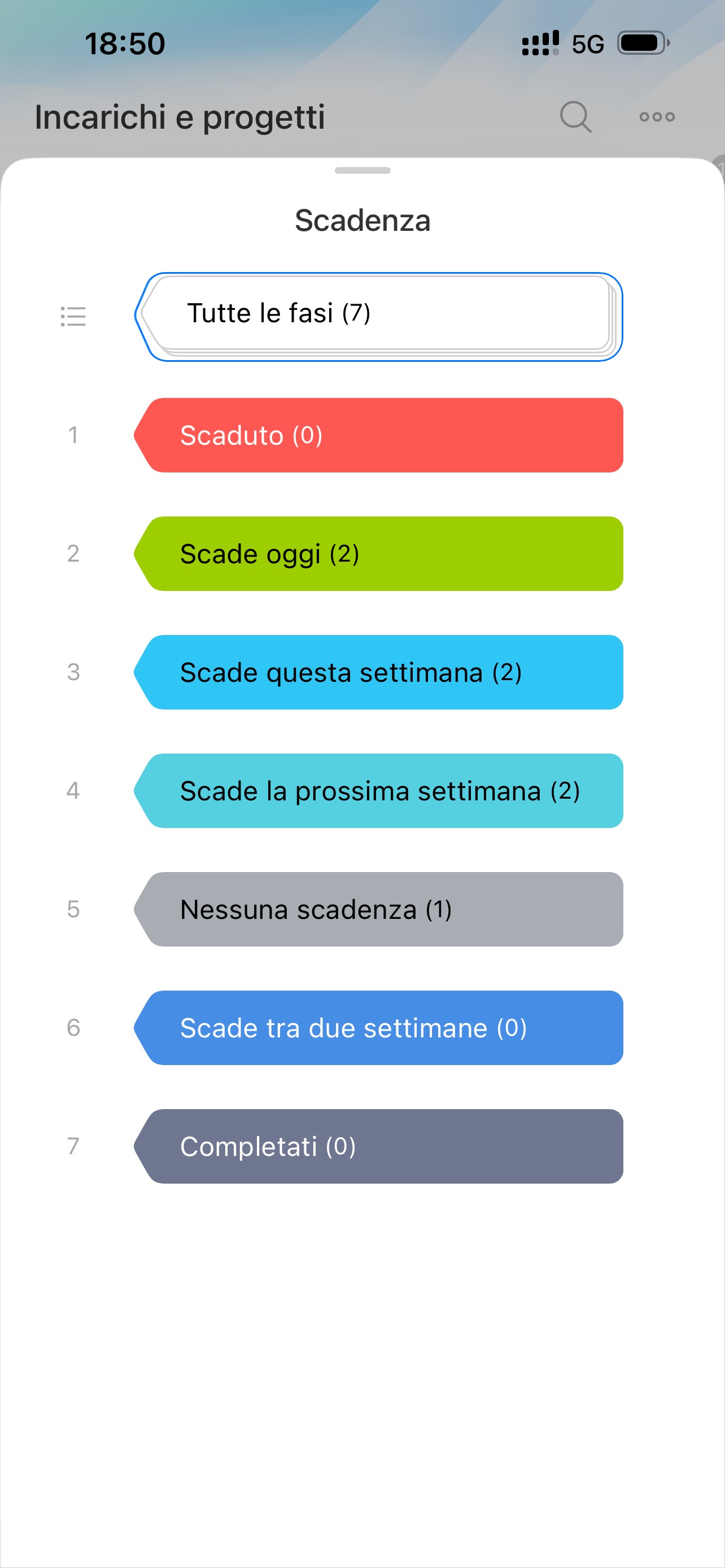Nella visualizzazione Scadenza, gli incarichi sono divisi in sei fasi in base alla data di scadenza: