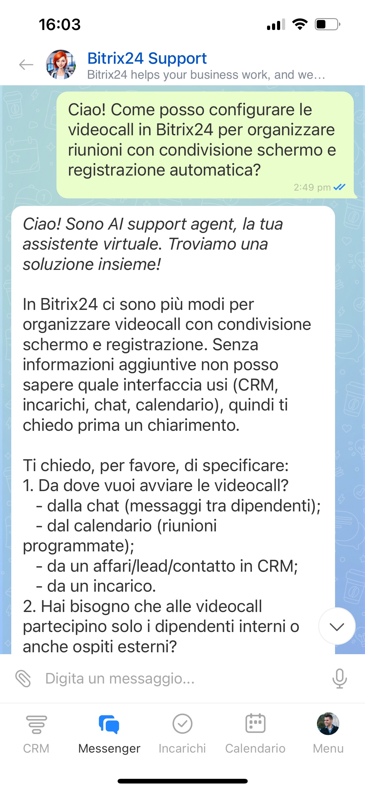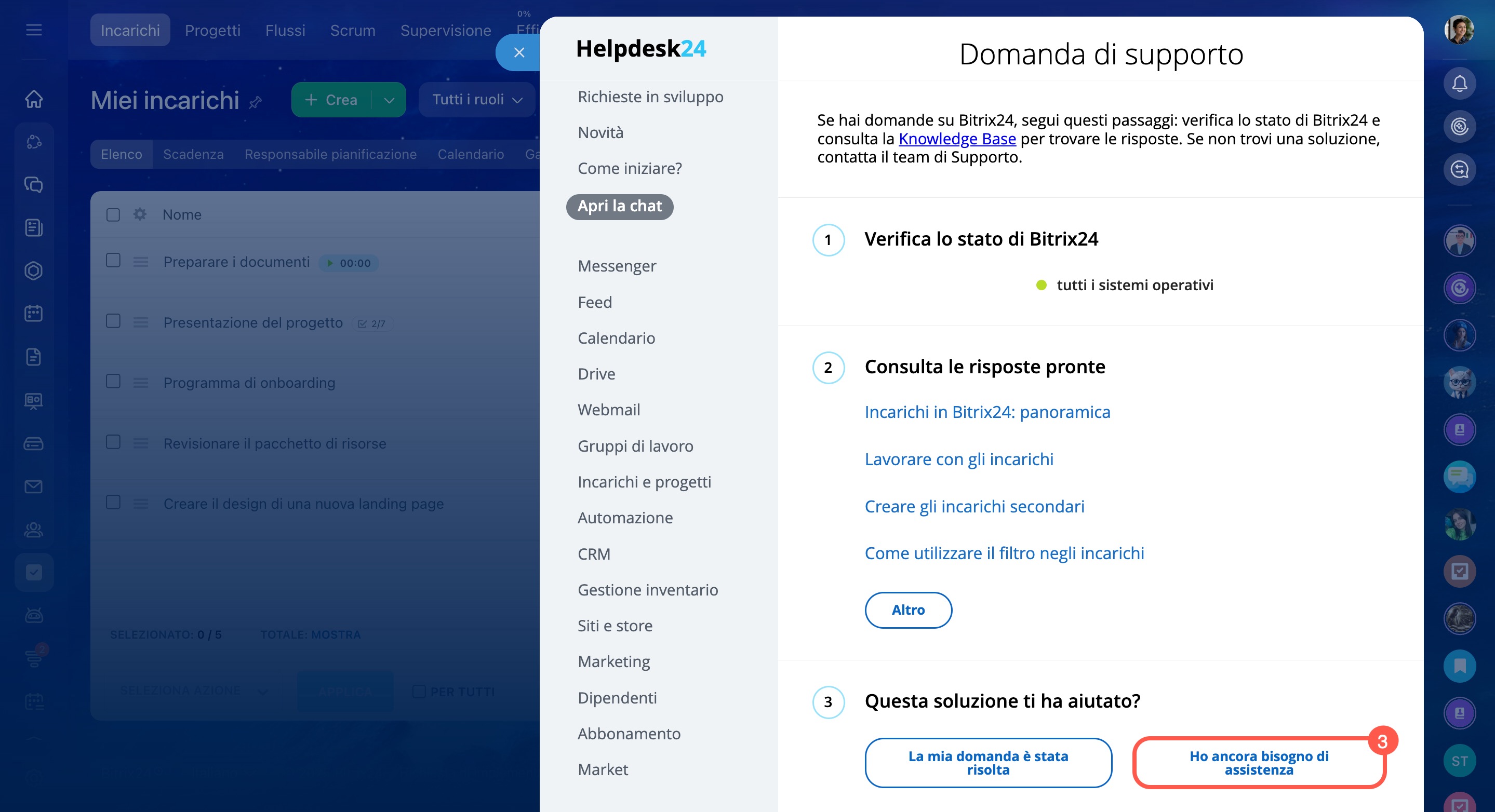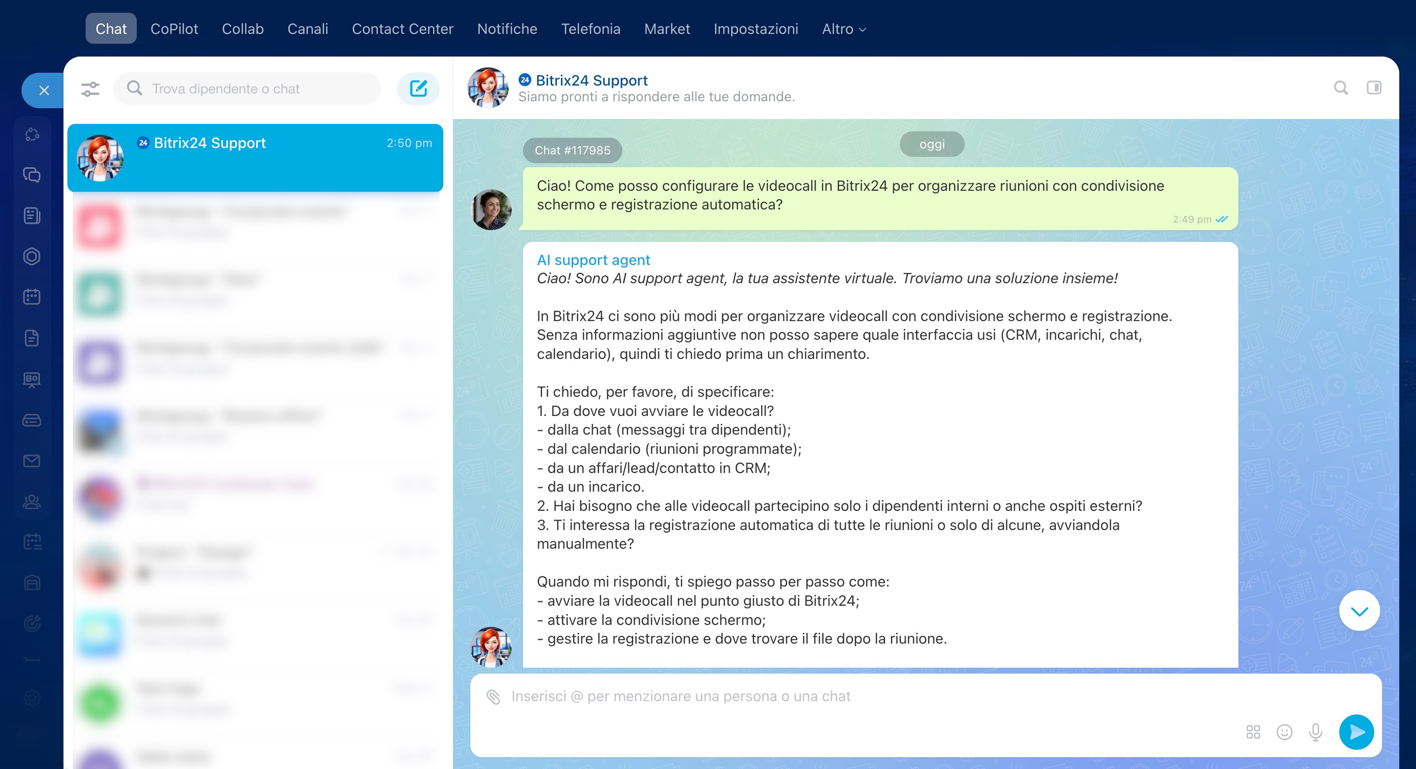 Si aprirà la chat di supporto di Bitrix24. Descrivi nel modo più dettagliato possibile la tua domanda: cosa stai facendo, quale risultato ti aspetti e cosa ottieni effettivamente. Inizialmente ti risponderà un assistente virtuale. Se non sarà in grado di aiutarti, un esperto del supporto Bitrix24 si unirà alla chat.